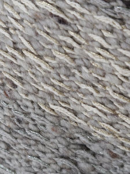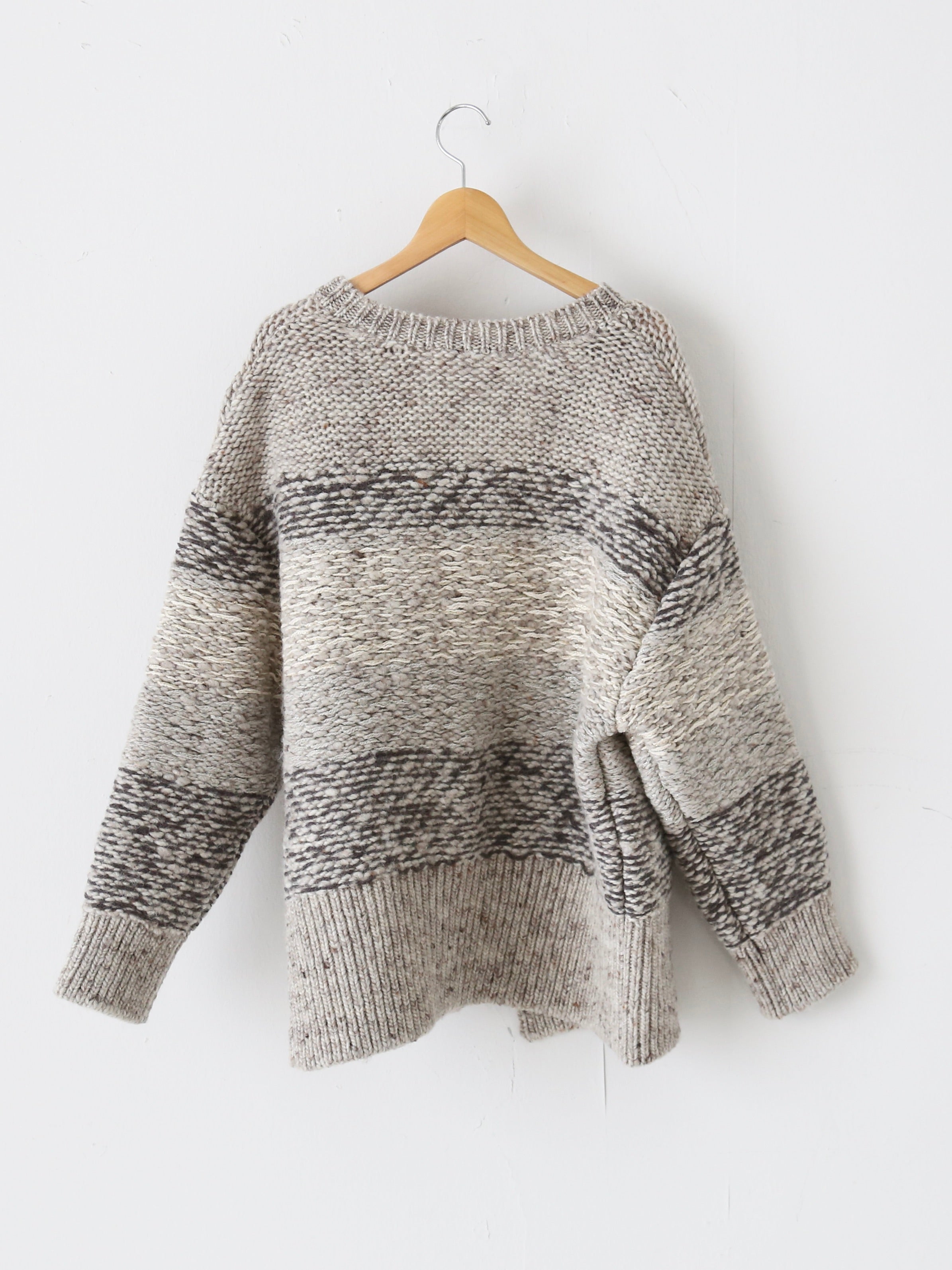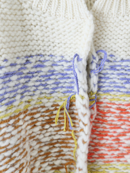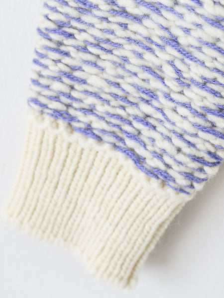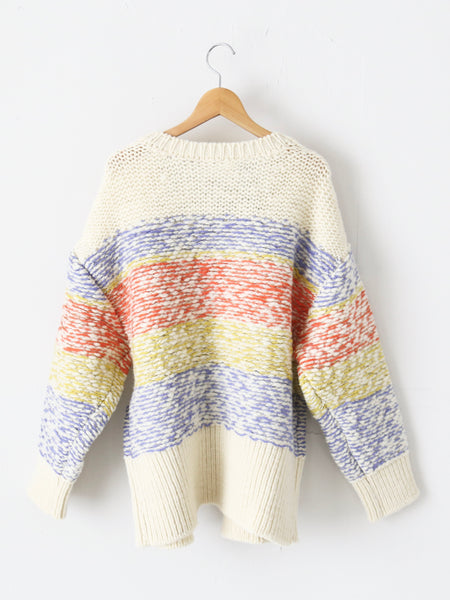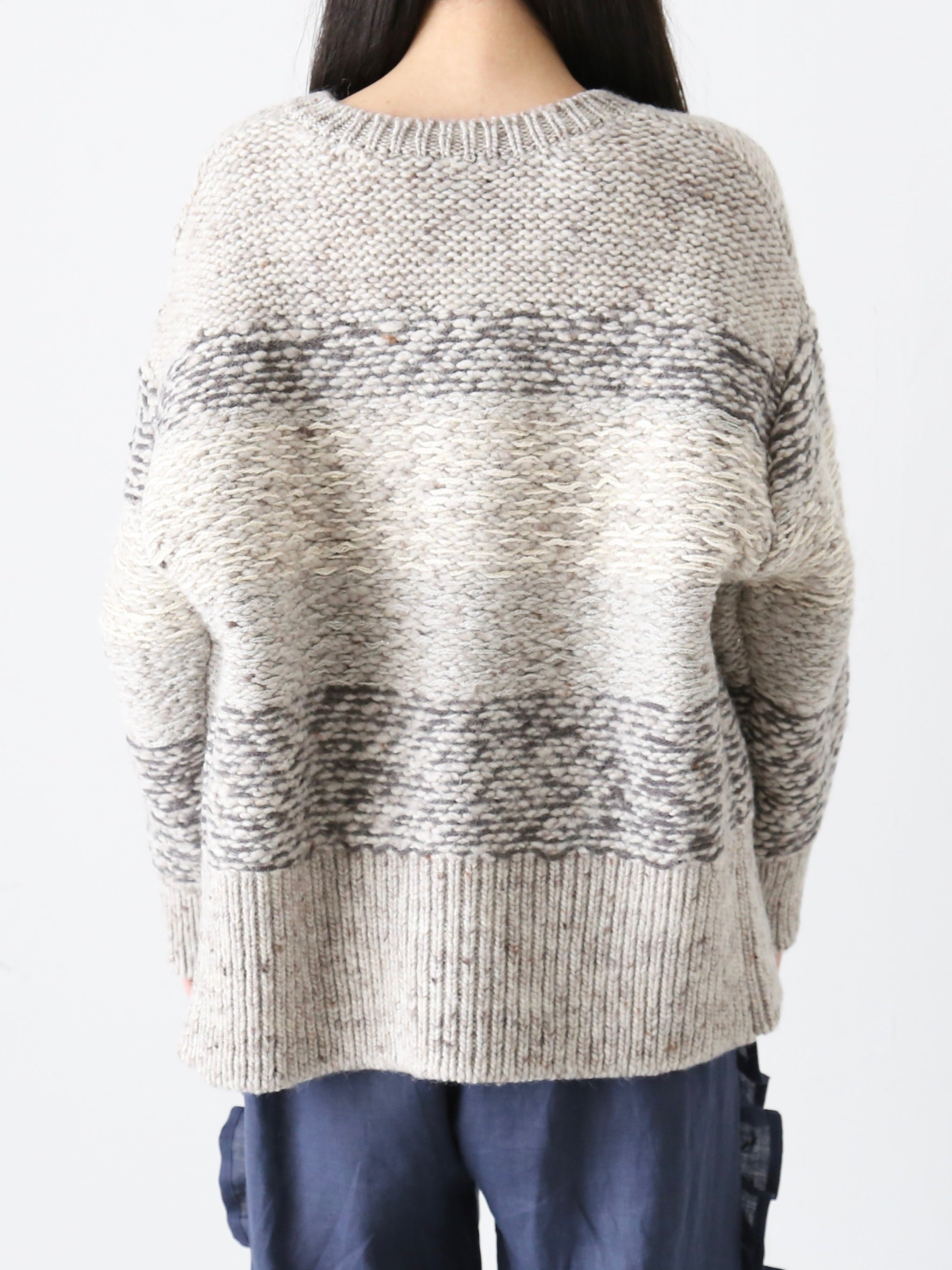 英国羊毛を使用した手紡ぎ風スラブヤーンをベースに、色鉛筆で描いたようなジャガードボーダーが特徴の手編み風ニットシリーズ。