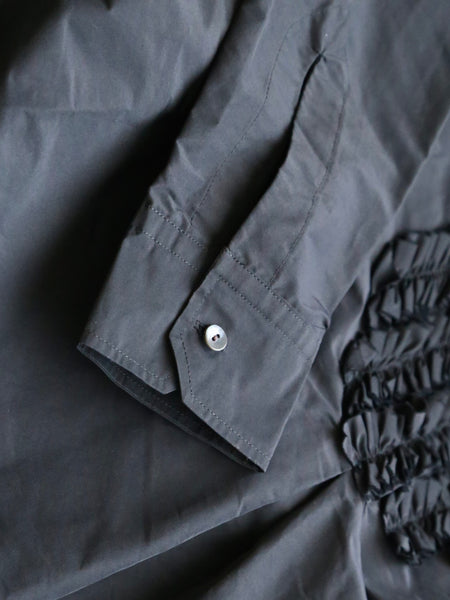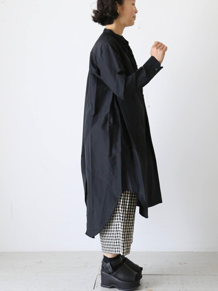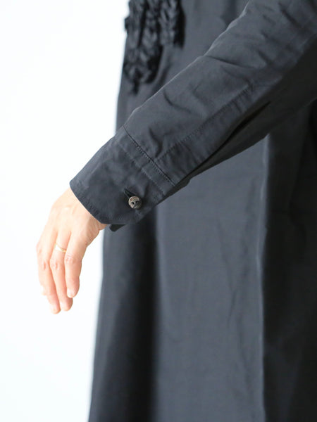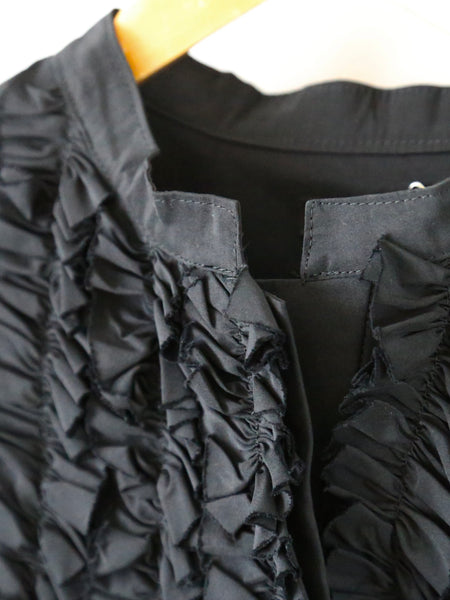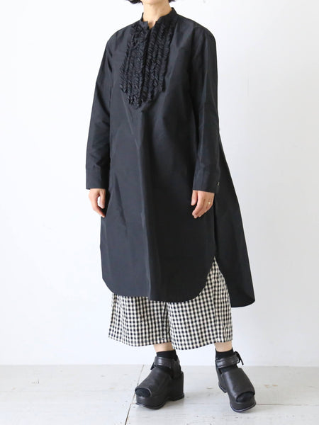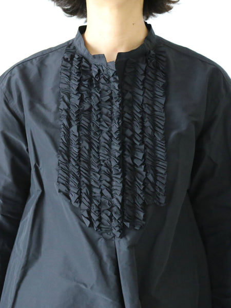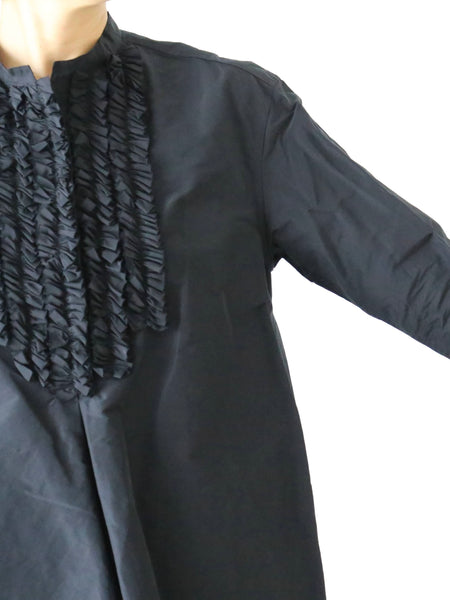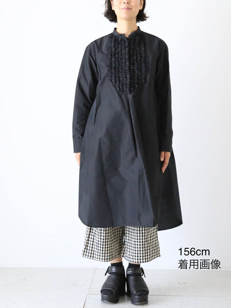 胸元のフリル可愛らしい、コットンポリエステルタフタ素材のブラウスドレス。