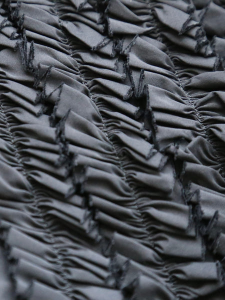 胸元には繊細なフリルをあしらい、フェミニンな印象に。