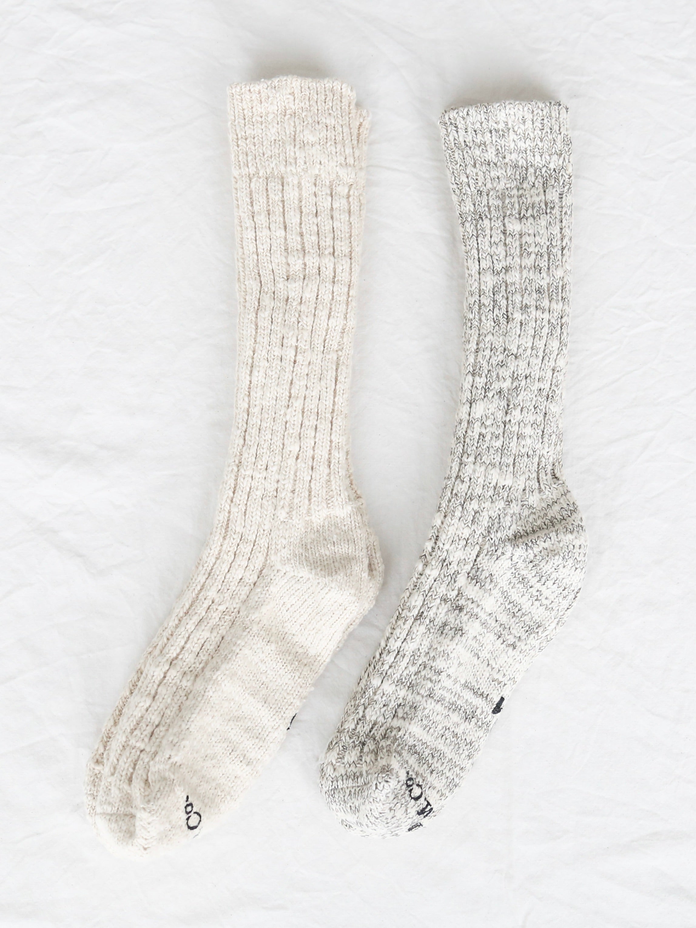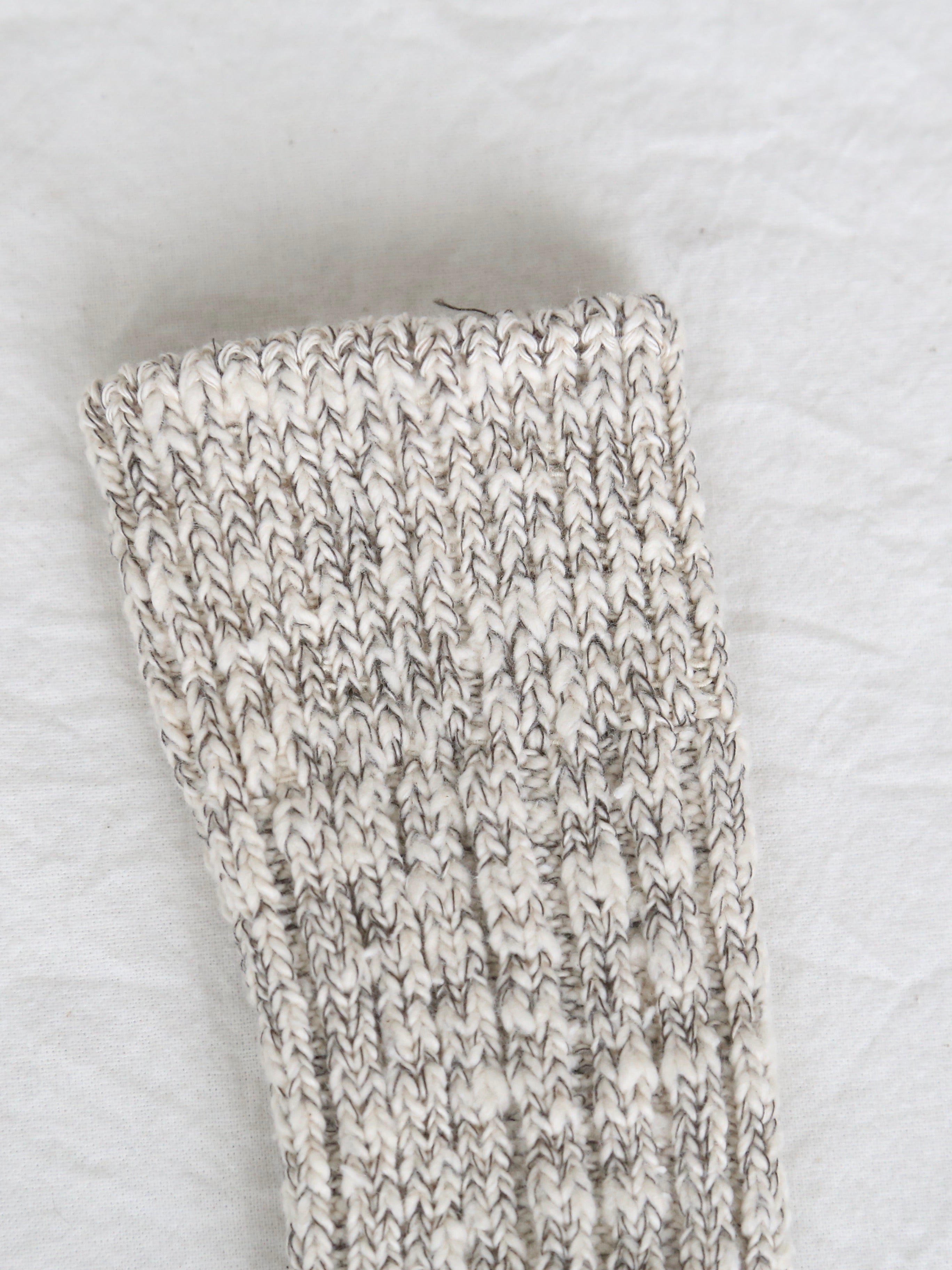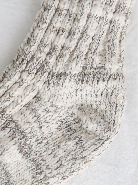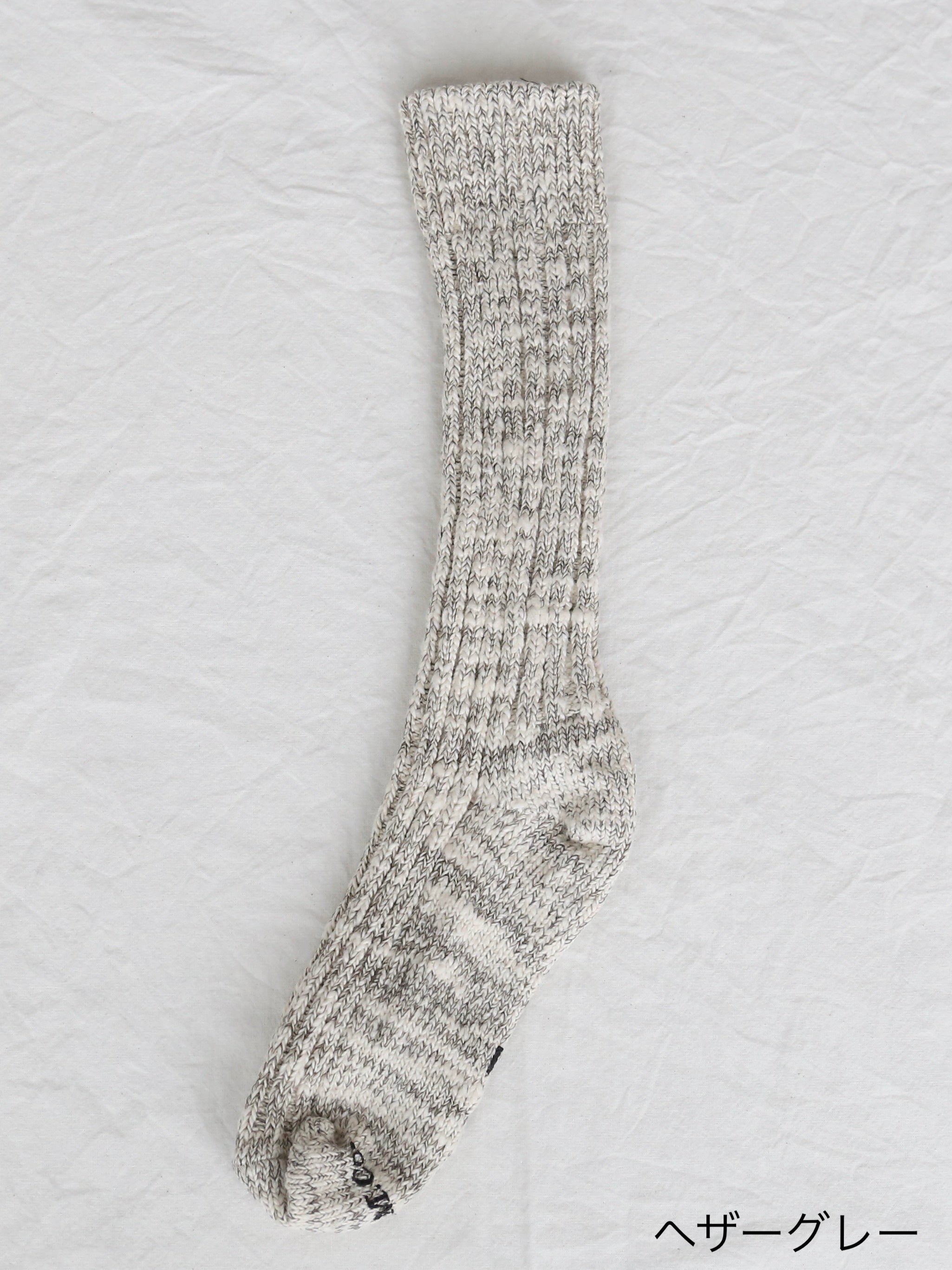 ガラ紡の糸は手紡ぎに近く、糸が太かったり細かったり…そんな糸で編まれたこちらのソックスは、ざっくり、ぼこぼこした素朴で優しい風合いがあります。