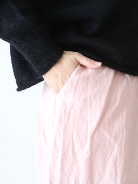 膝下から内側に向かう生地の流れが美しく、生地の質感と相まって美しいドレープを見ていただけます。