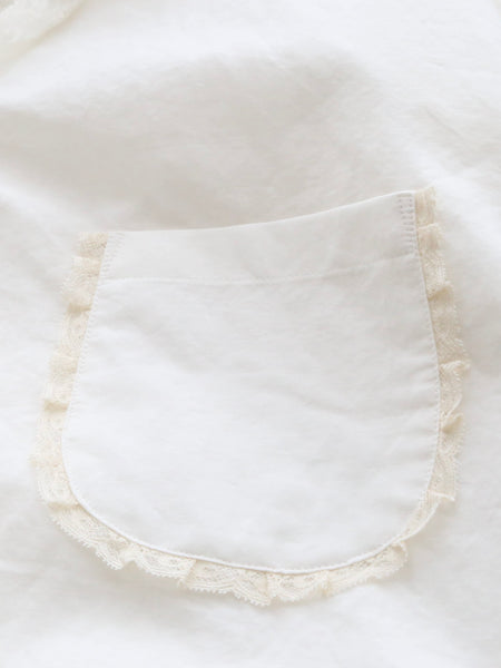 襟元、袖口、裾、ポケットの周りのさりげないレースがポイント。