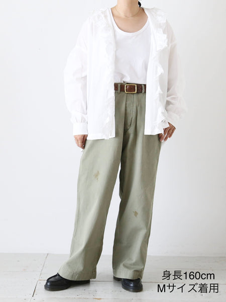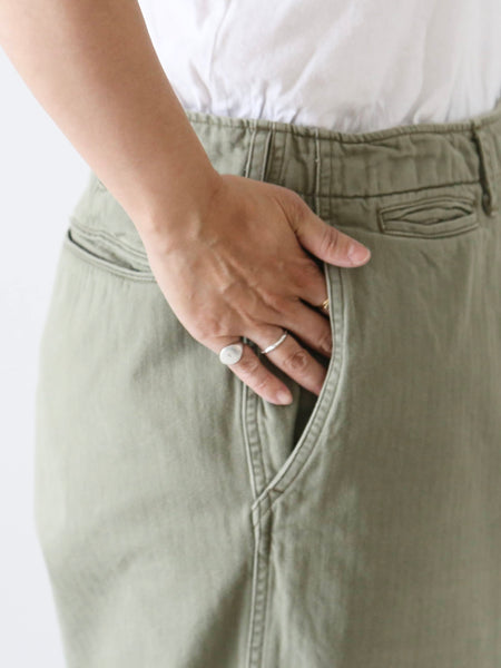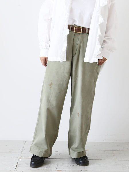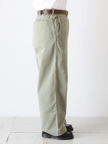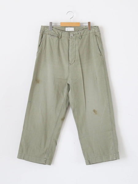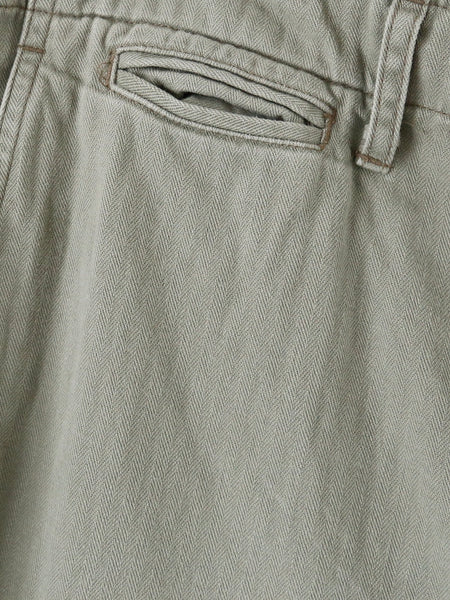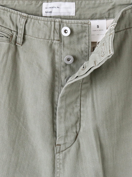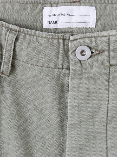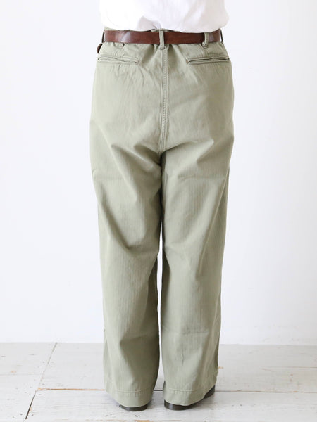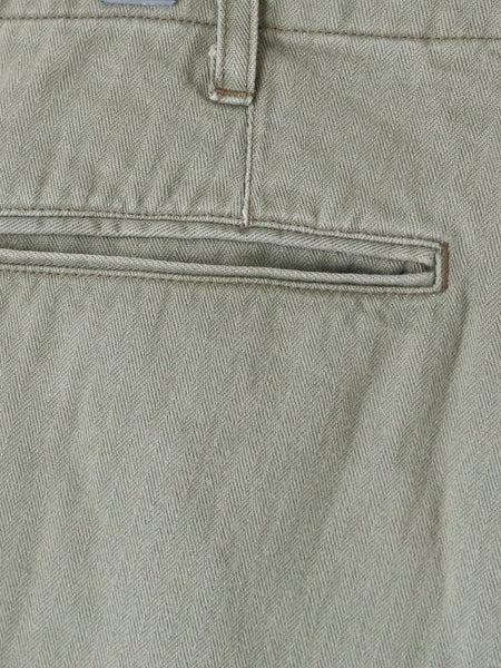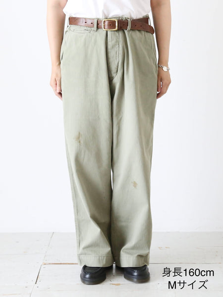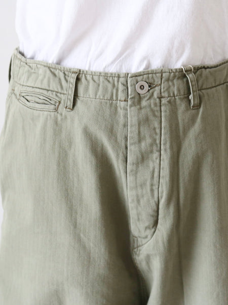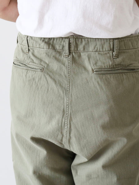 chimala (チマラ)ヘリンボーンUSアーミーデニムオフィサートラウザー [CS40-MP15B/S]色:カーキグリーン素材:コットン100%サイズ:S/MS ウエスト:41cm ヒップ:56cm 股上:38cm 股下:62cm 裾幅:26cm わたり:35cmM ウエスト:43cm ヒップ:58cm 股上:38cm 股下:64cm 裾幅:27cm わたり:37cm*平置き寸法です。多少の誤差はご容赦くださいませ。