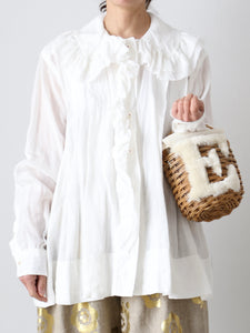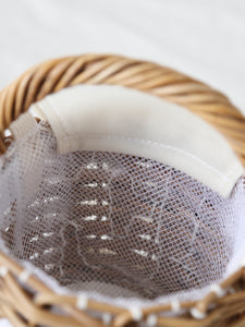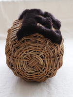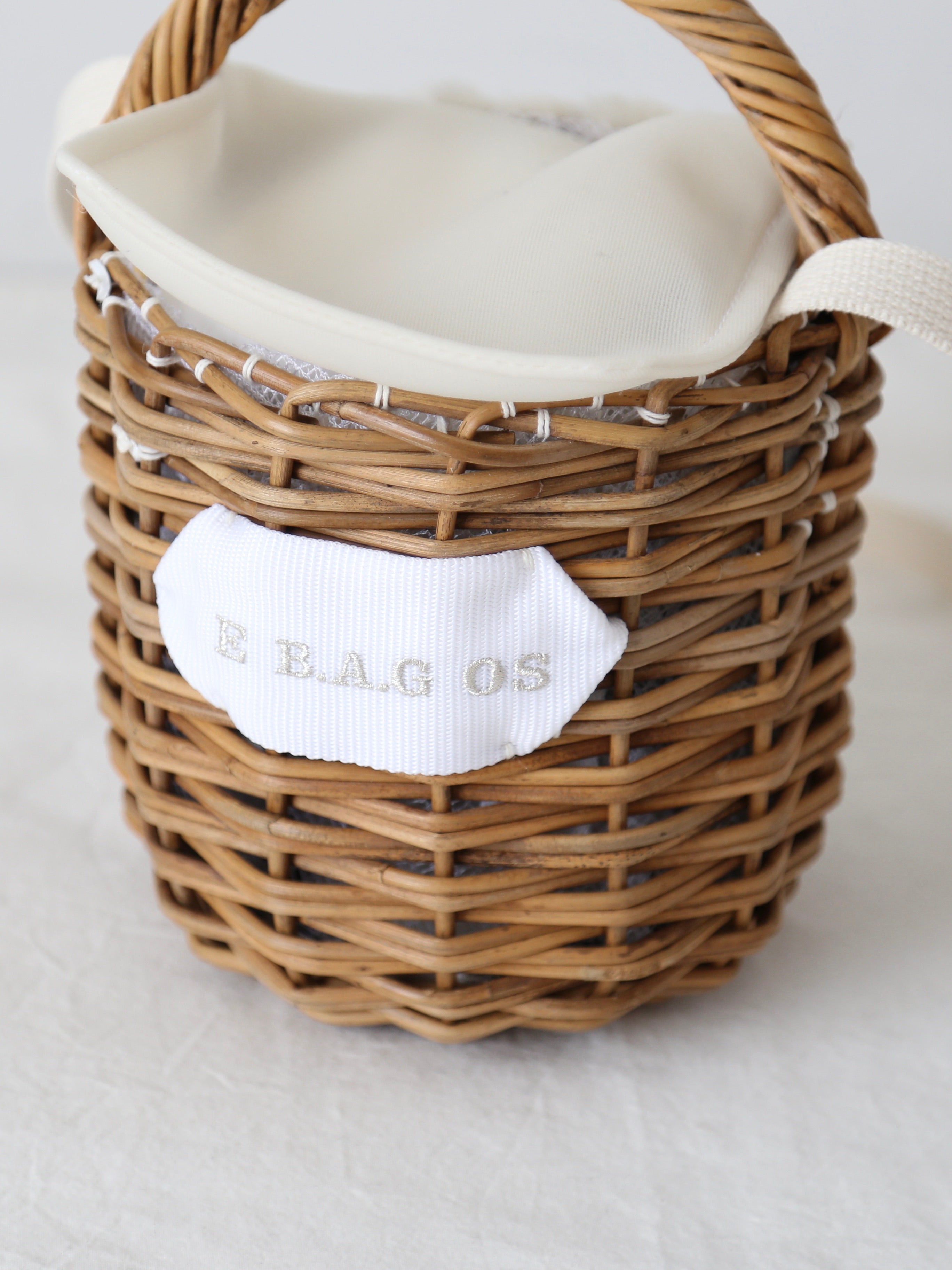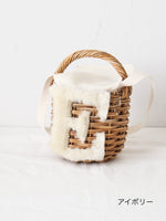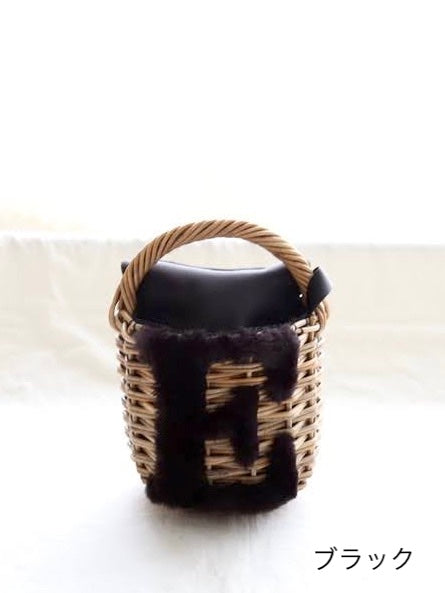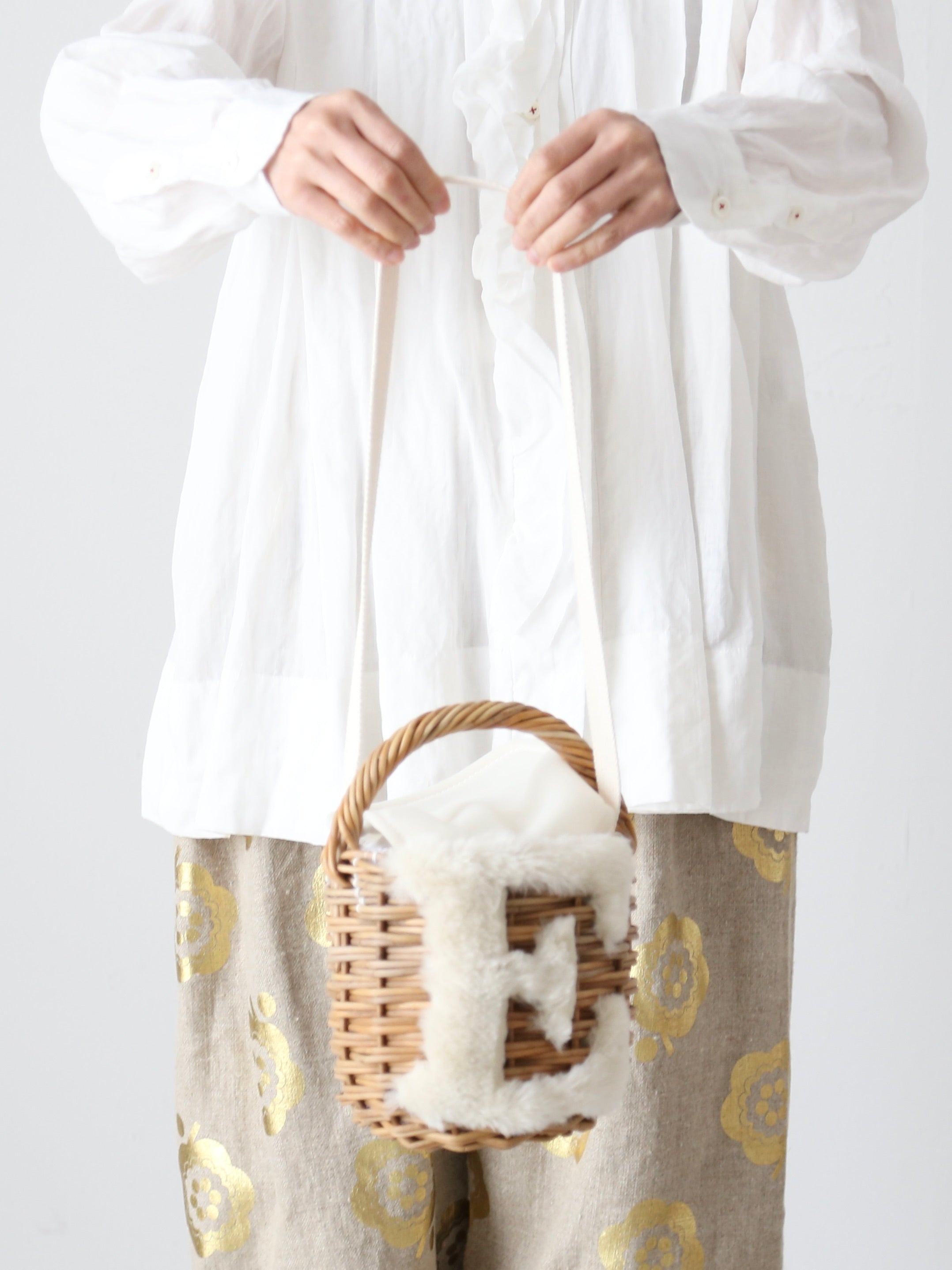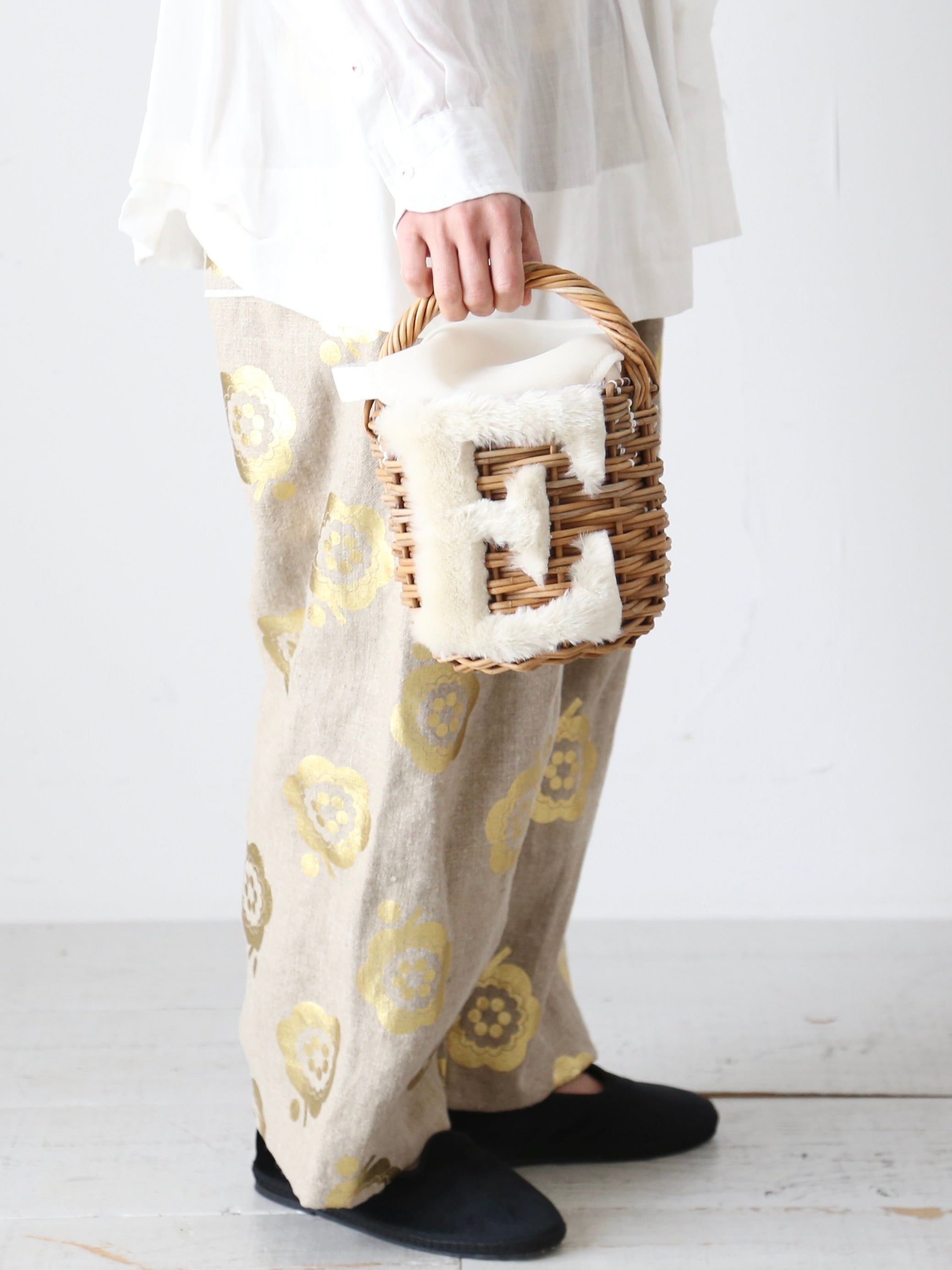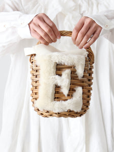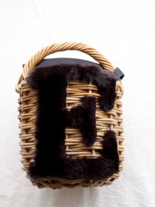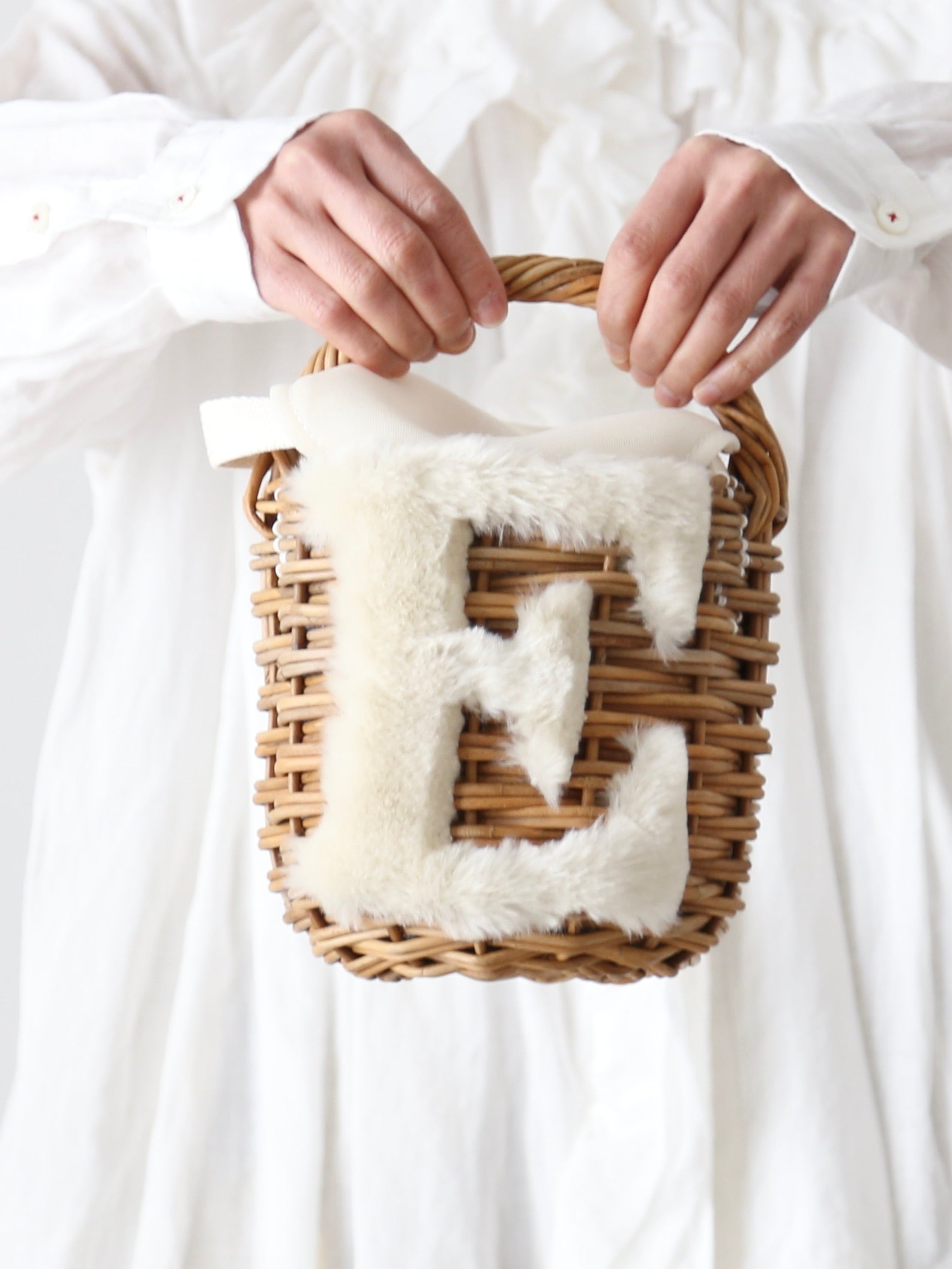 かわいい丸型バスケットに、大きくEのアクリルファーがアップリケされています。