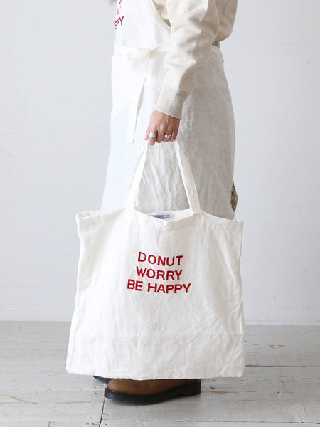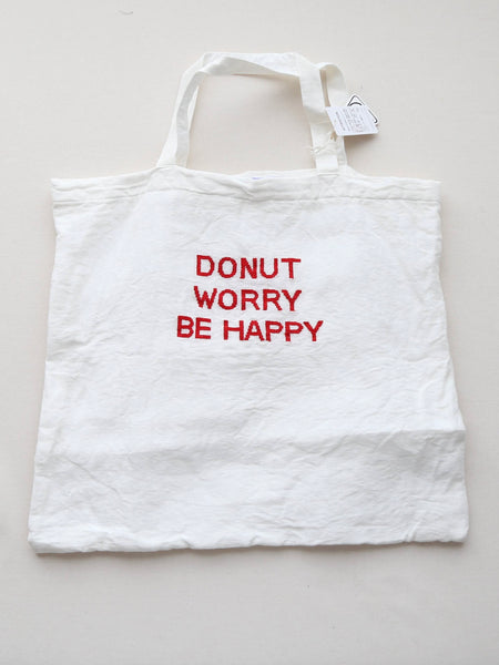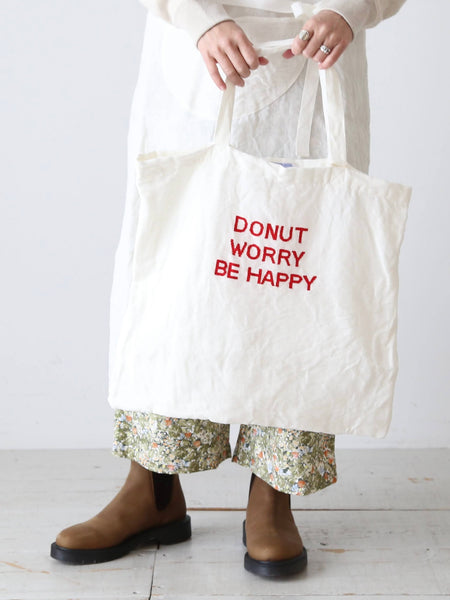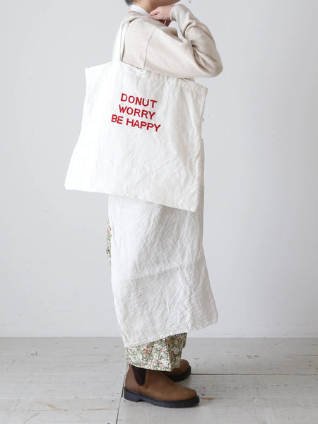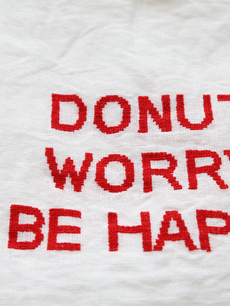 今回は白地に DONUT WORRY BE HAPPY という赤い刺繍文字。