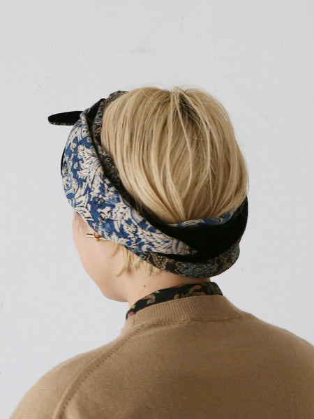 ベロアの光沢と、インドのブロックプリント柄の落ち着いた色彩によって上品な雰囲気のターバンが完成しています。