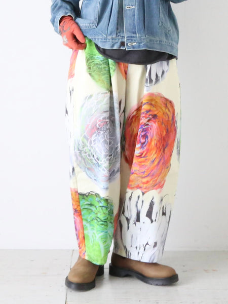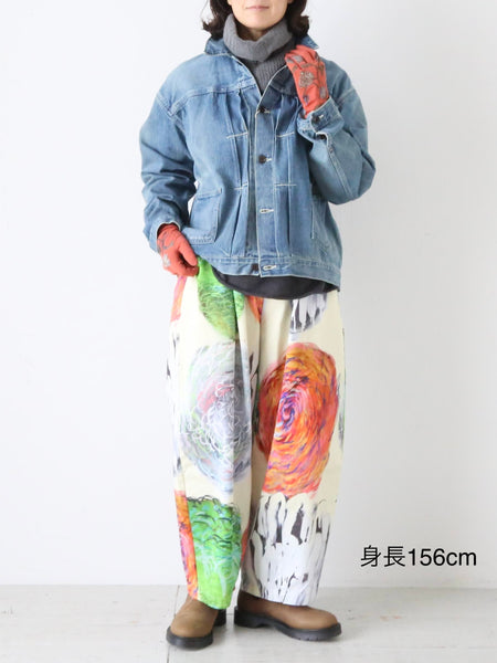 今季の代表アイテム、アーティスト吉野マオさんとのコラボレーションテキステイルで作られたパンツ。
