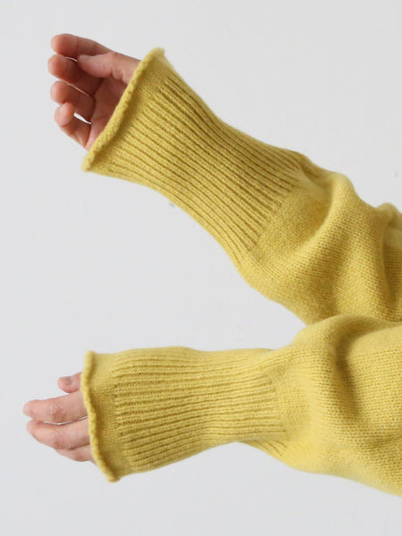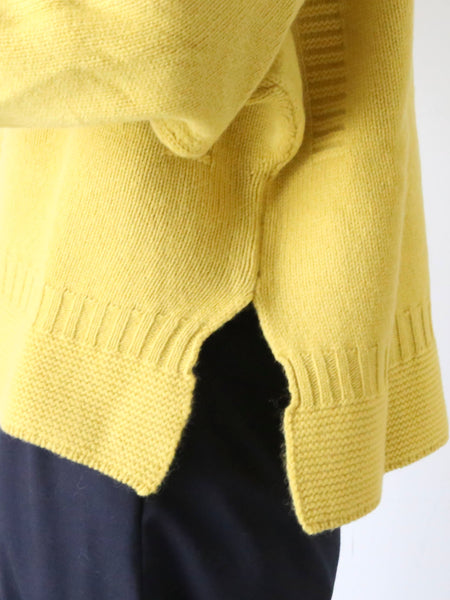 ネックはあえて手編み風にうねらせ、家庭で編まれたセーターのような素朴さを出しています。首元に程よくゆとりがあるのも嬉しいポイント。楽にお召しいただけますし、小顔効果も・・・