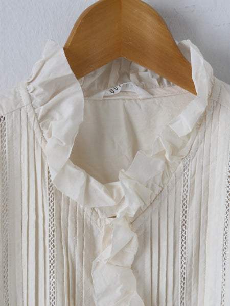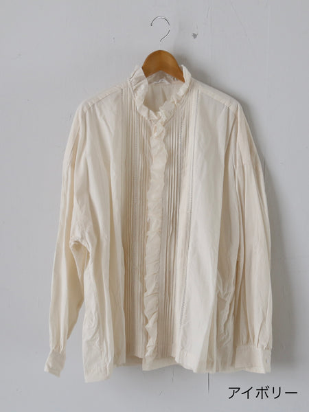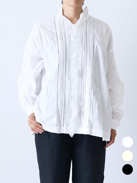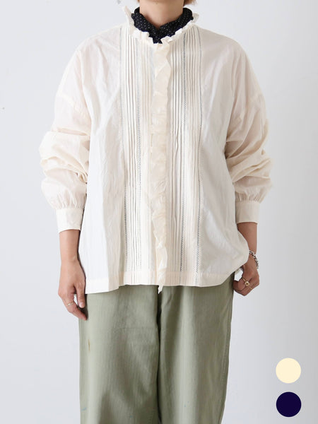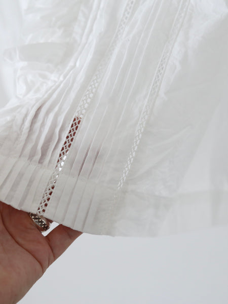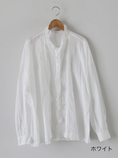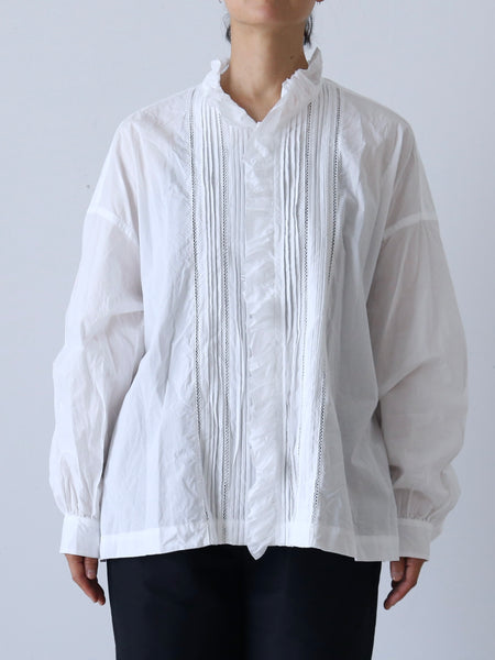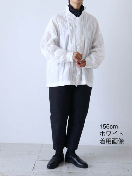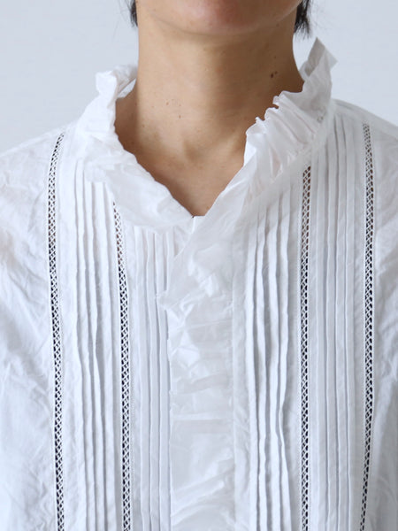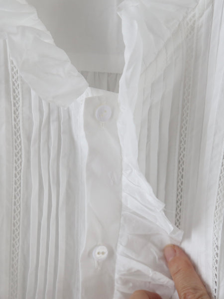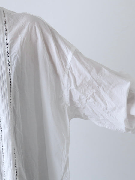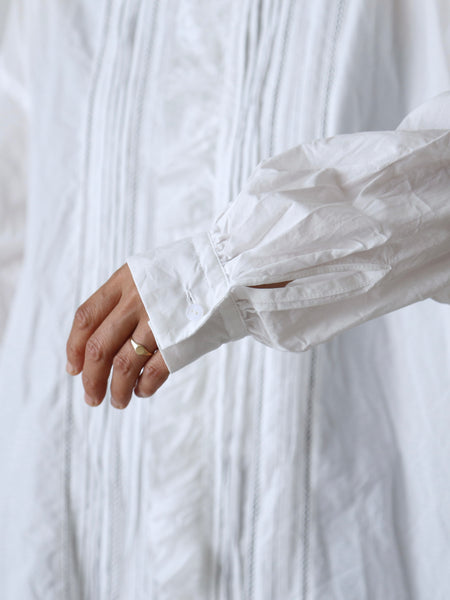 襟から裾にかけて繊細なピンタックと上品なはしごレースをあしらい、