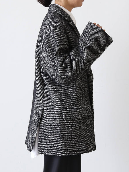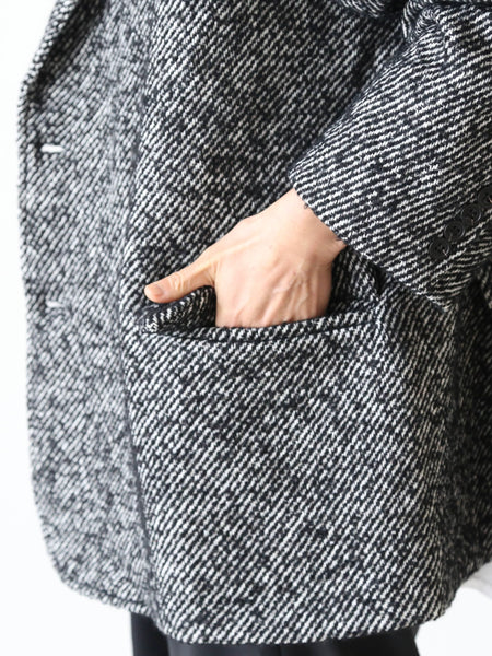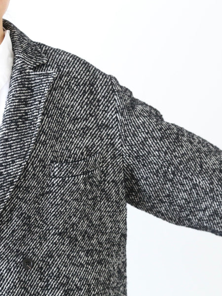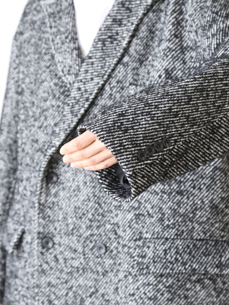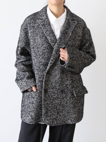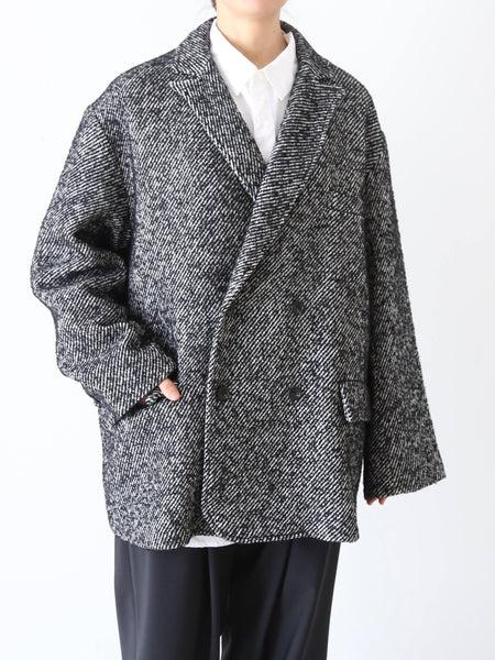 Honnete Double Breasted Overfit Jacket [HO-25AWJ13] Colors: Black / Black x White Material: Wool 59%, Acrylic 19%, Polyester 13%, Nylon 7%, Cotton 1%, Rayon 1% Size: One Size Sleeve length from center back: 79.5cm, Width: 61cm, Length: 76.5cm *Measurements are taken when laid flat. Please allow for slight discrepancies.