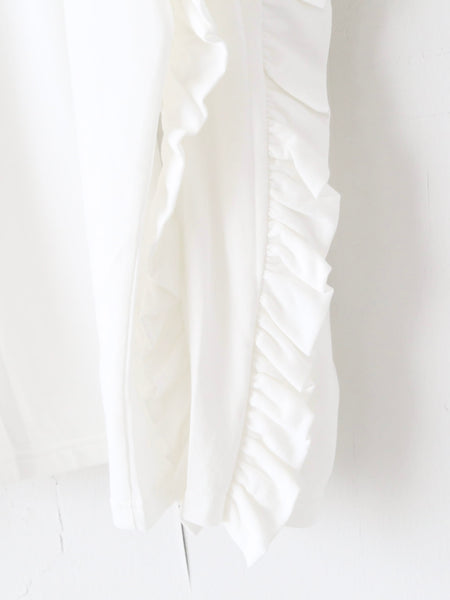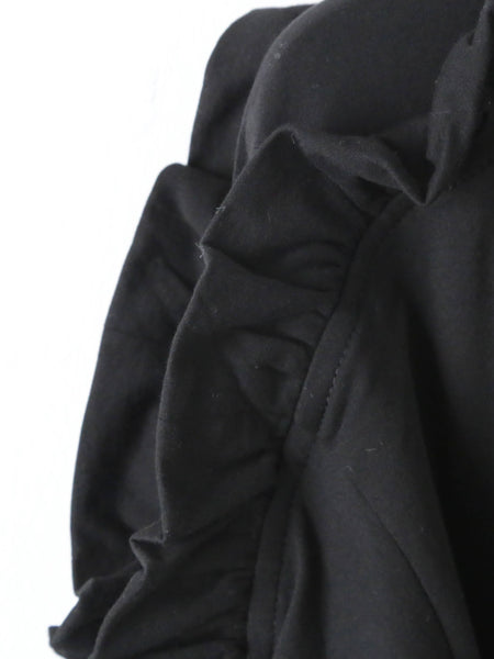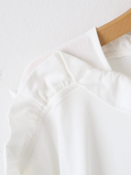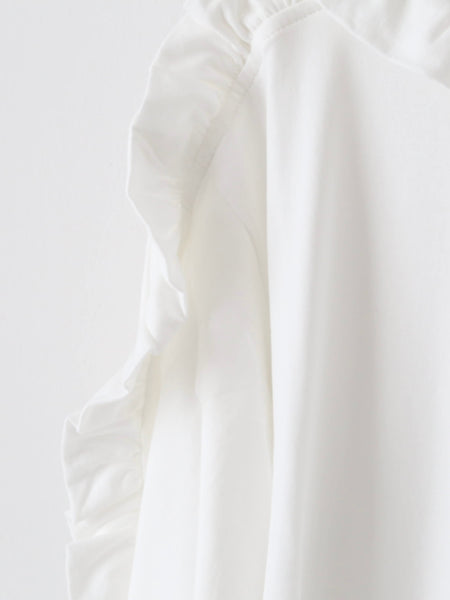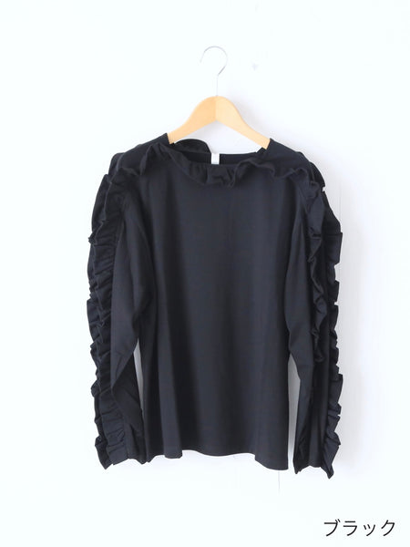 By attaching the ruffle facing upwards, the movement of the wing-like ruffle from the shoulder to the arm creates a striking impression when viewed from the side.