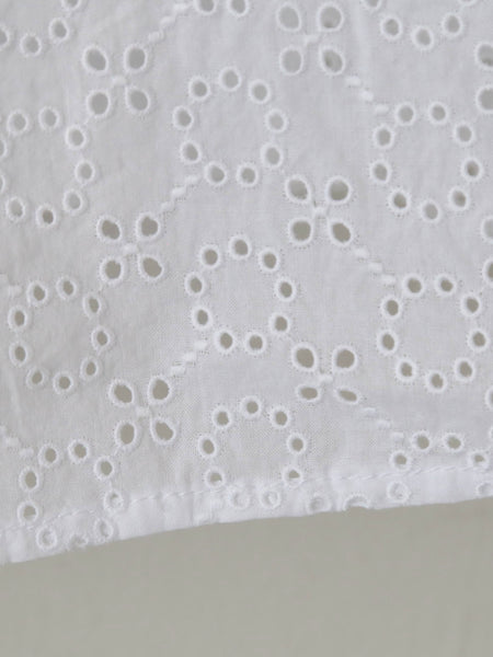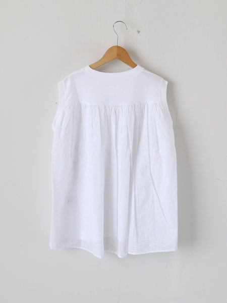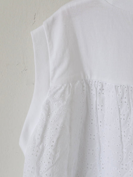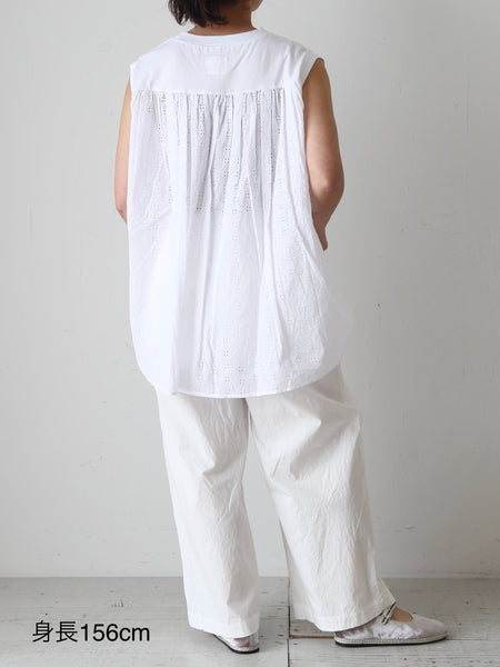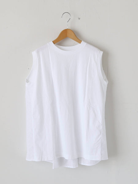 TOUJOURS Sleeveless Combination T-shirt [FM44ZT07] (CUT WORK EMBROIDERY COTTON CLOTH) Color: White Material: 100% Cotton Size: F Shoulder width: 42.5cm, Bust: 58cm, Armhole: 21cm, Length: 64.5cm (front) 71.5cm (back) *Flat measurements. Please allow for slight discrepancies.