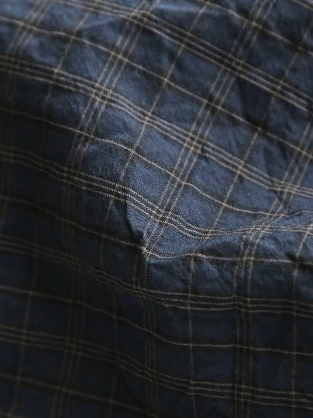 Made from high-quality Italian cotton fabric. At first glance, it looks plain, but if you look closely, it's a check pattern. A tattersall check pattern in light brown and black on a navy background. It's a chic and mature check pattern.