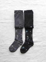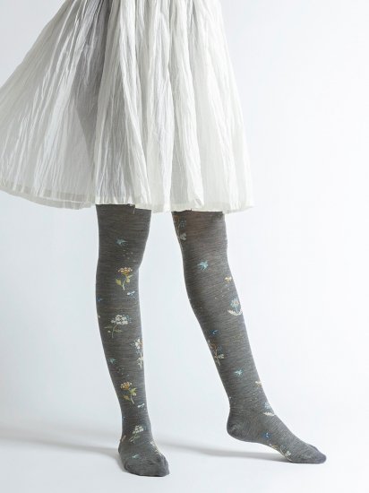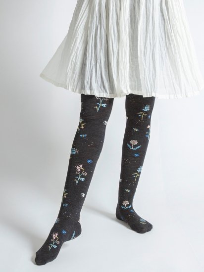 ヒナゲシ、デイジー、百合、紫陽花が軽やかに咲き誇る花壇が描かれたタイツ。