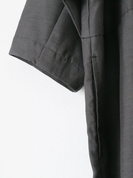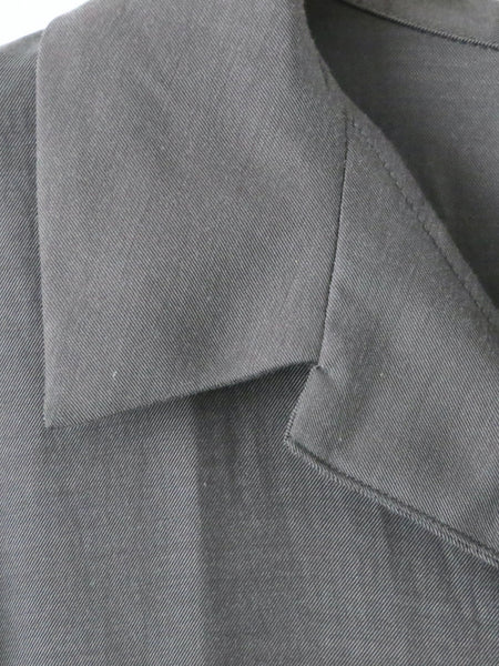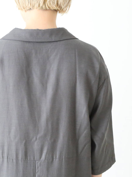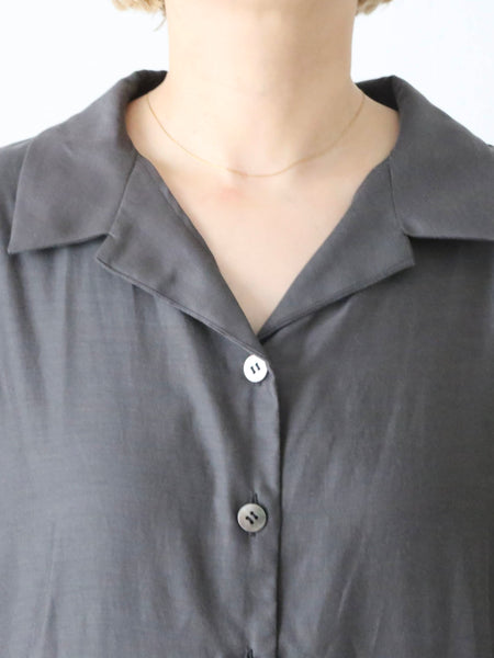 首元はオープンカラーでポイントに。顔まわりをスッキリ見せてくれます。