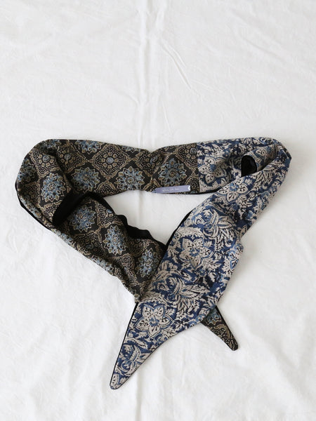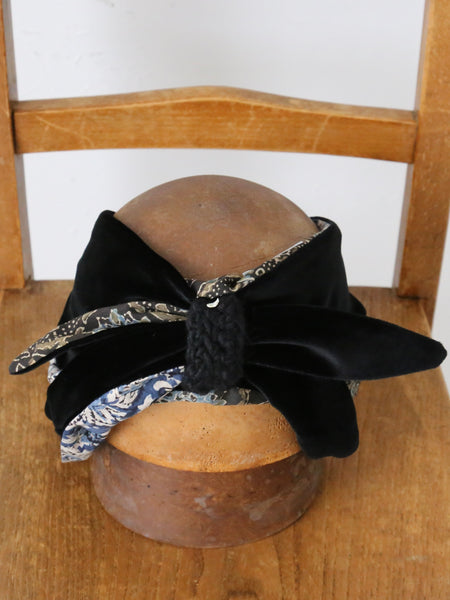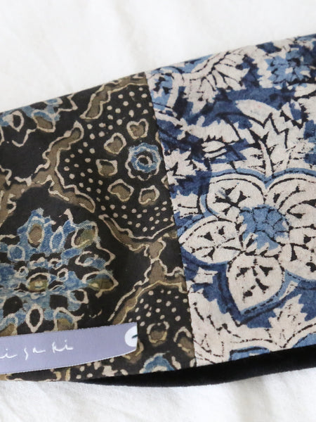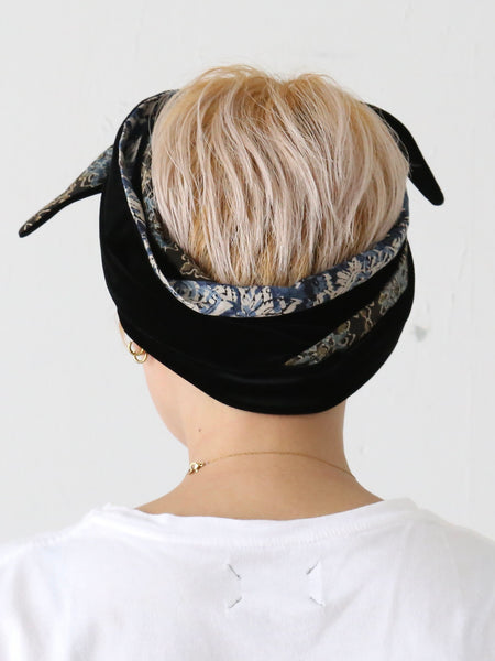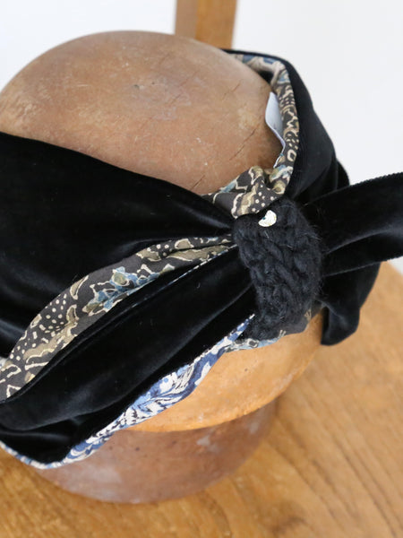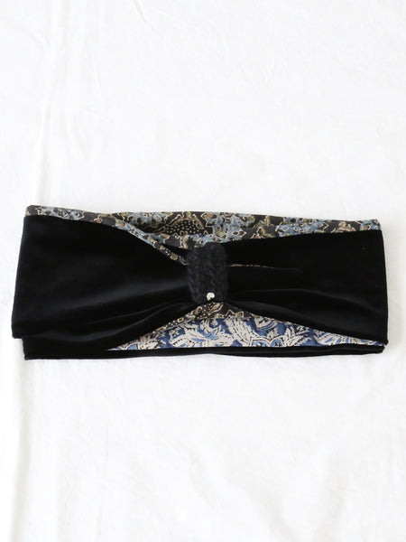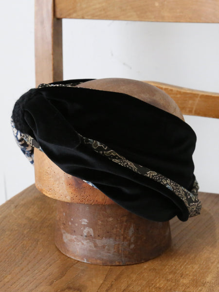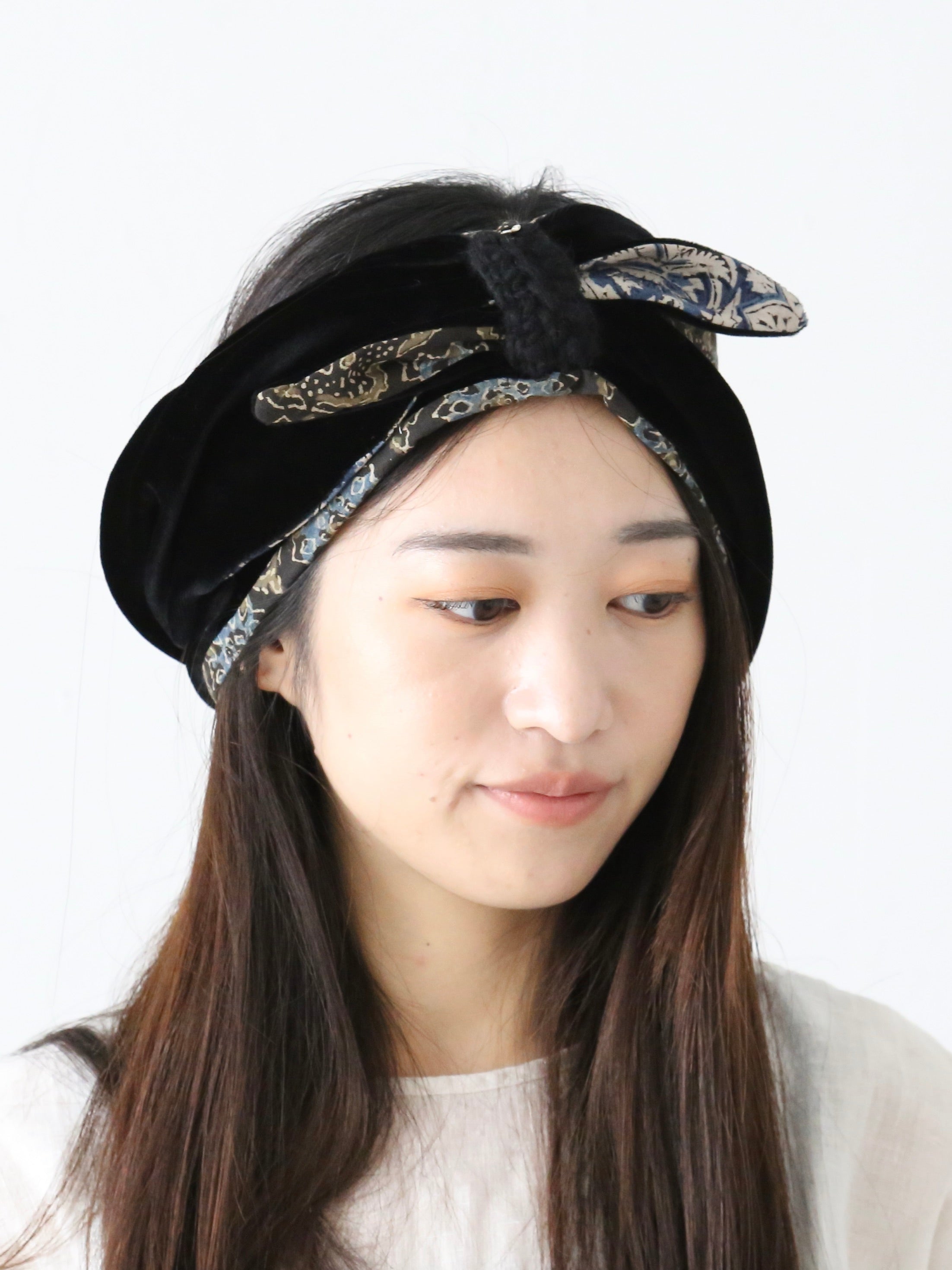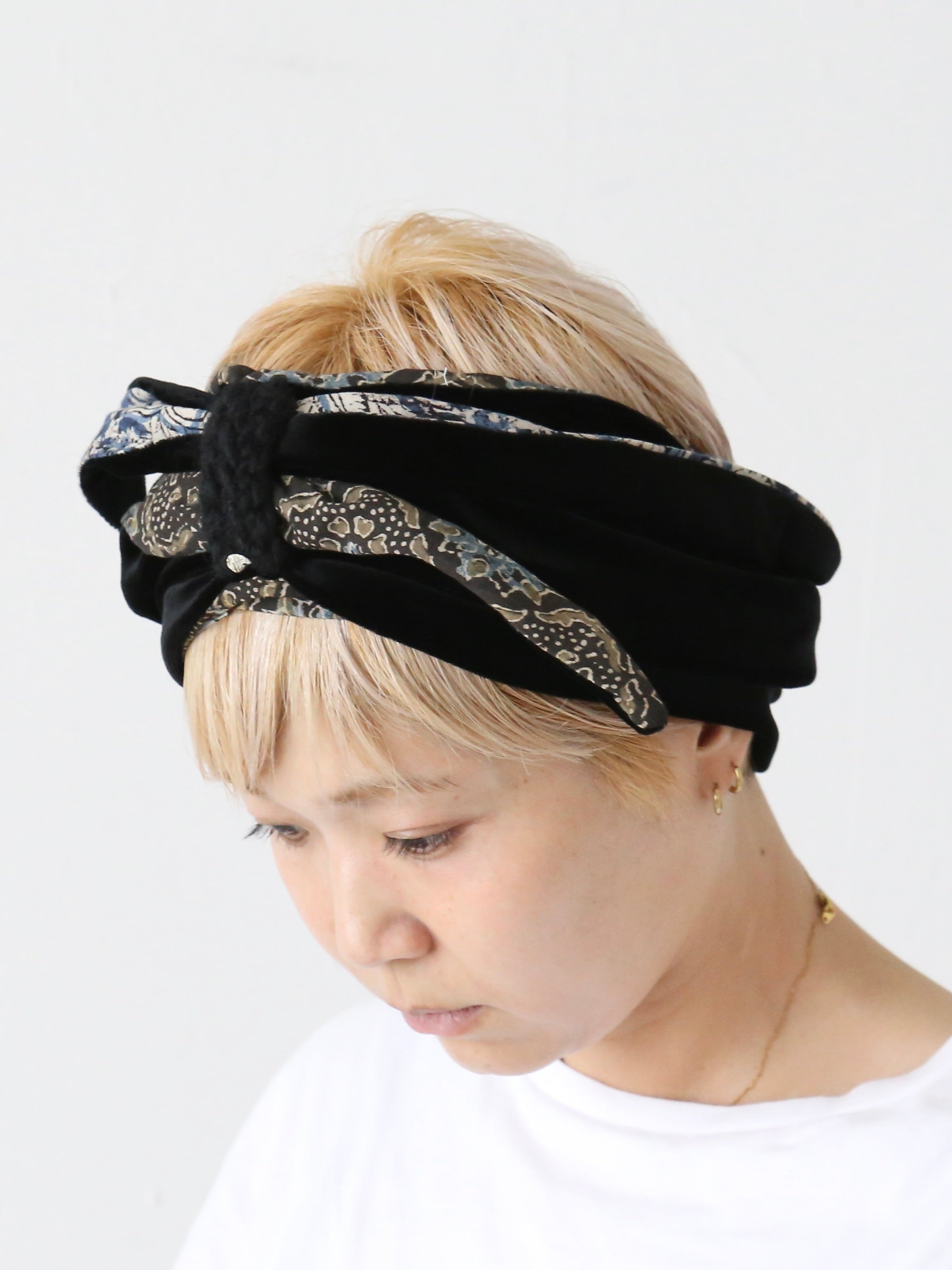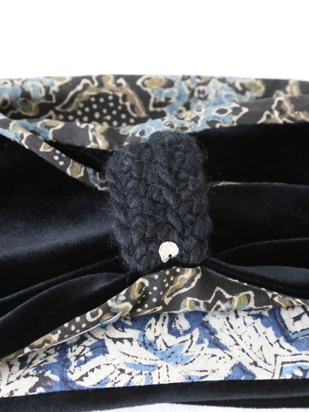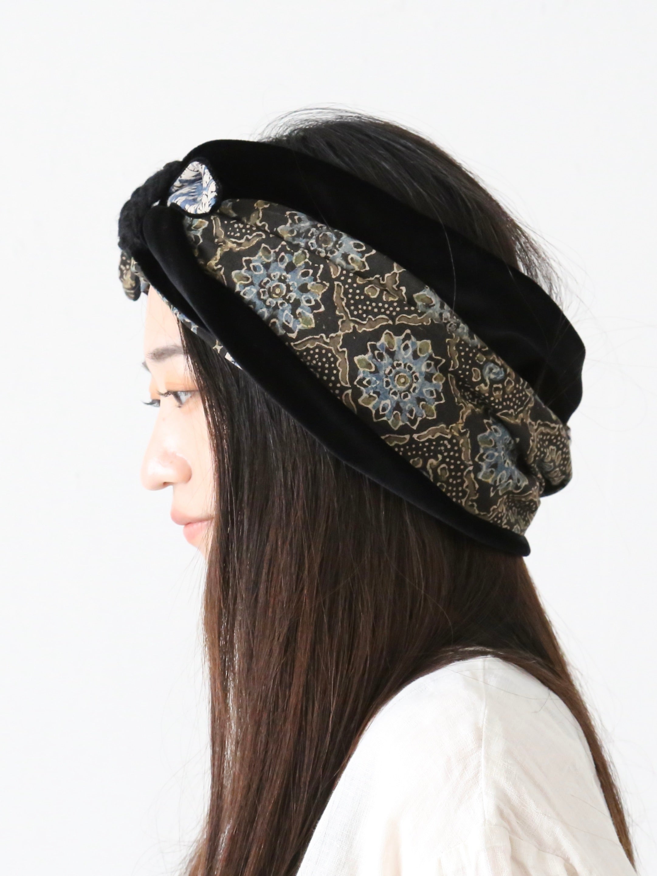 ベロアの光沢と、インドのブロックプリント柄の落ち着いた色彩によって上品な雰囲気のターバンが完成しています。