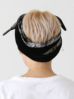 頭を大きく包んだり、ねじってポイントにしたり、結び目の位置を上にしたり下にしたりと、スカーフのようにしたり・・・使い方は自由自在です。