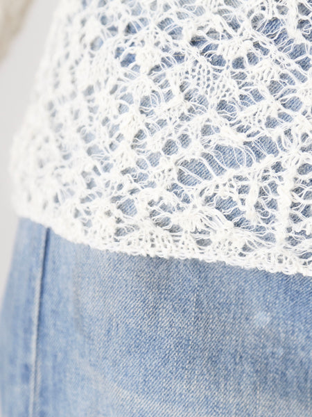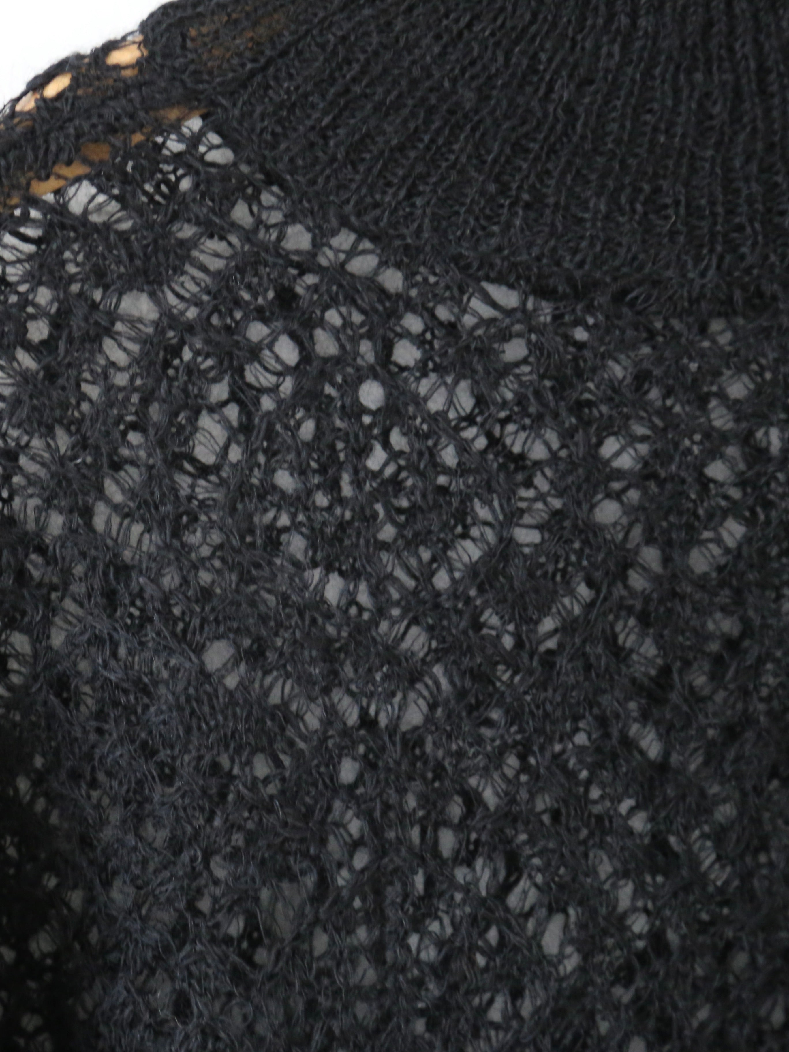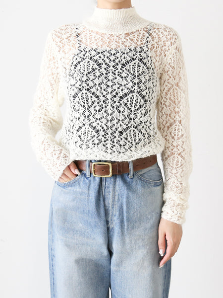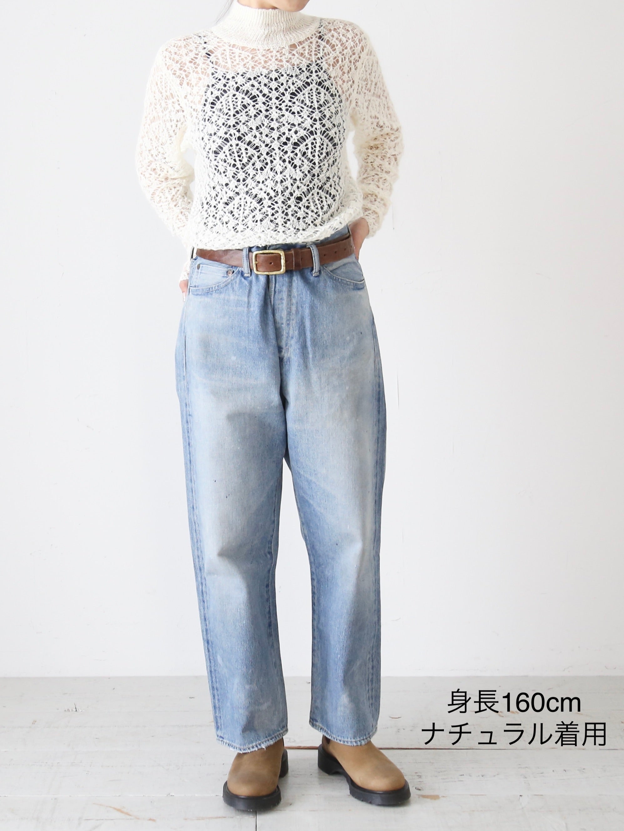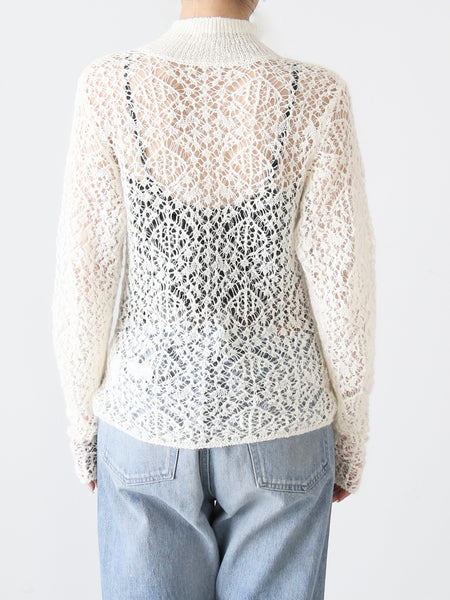 こんにゃく加工を施したスラブ綿糸と、高級な細番手にモヘヤを組み合わせたレースニット。
