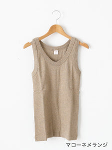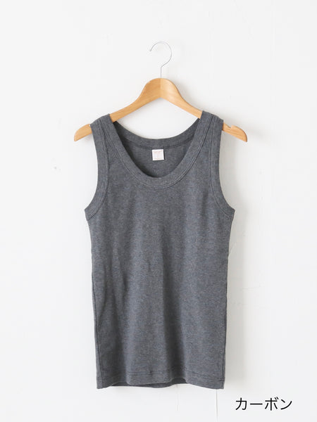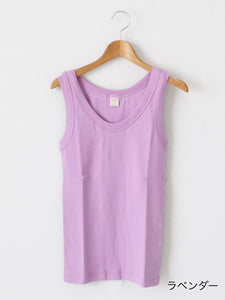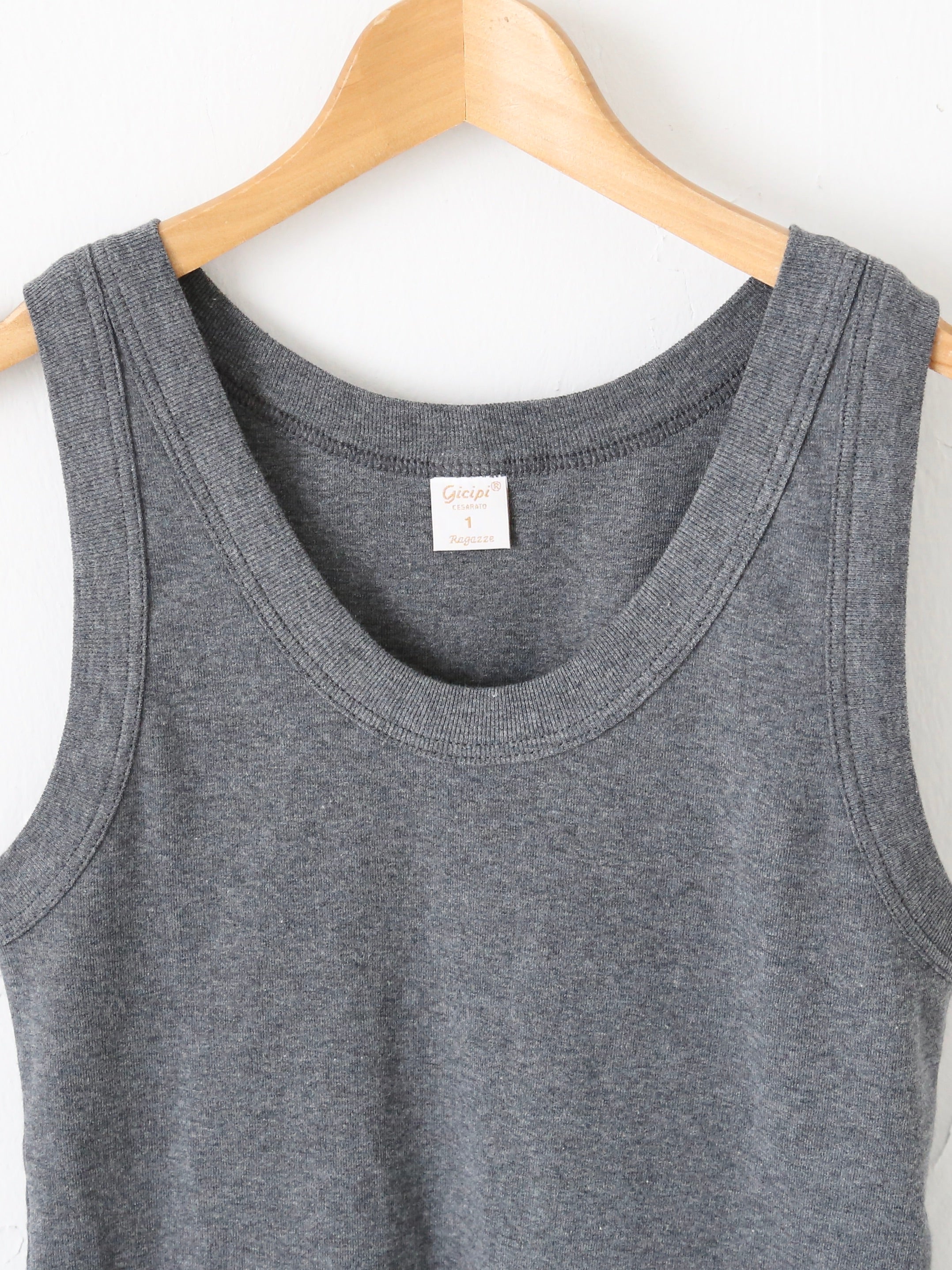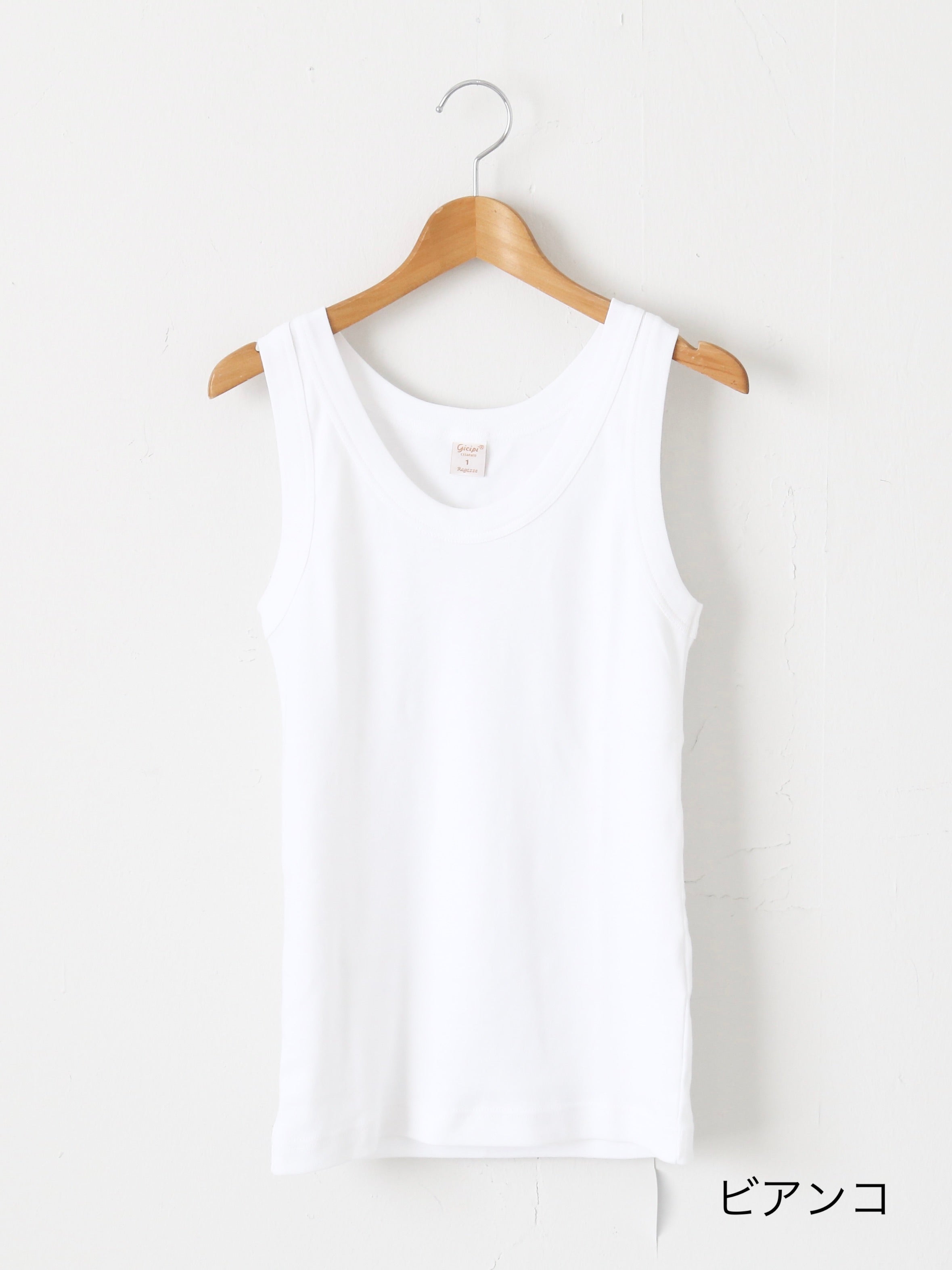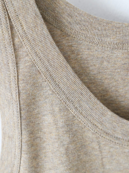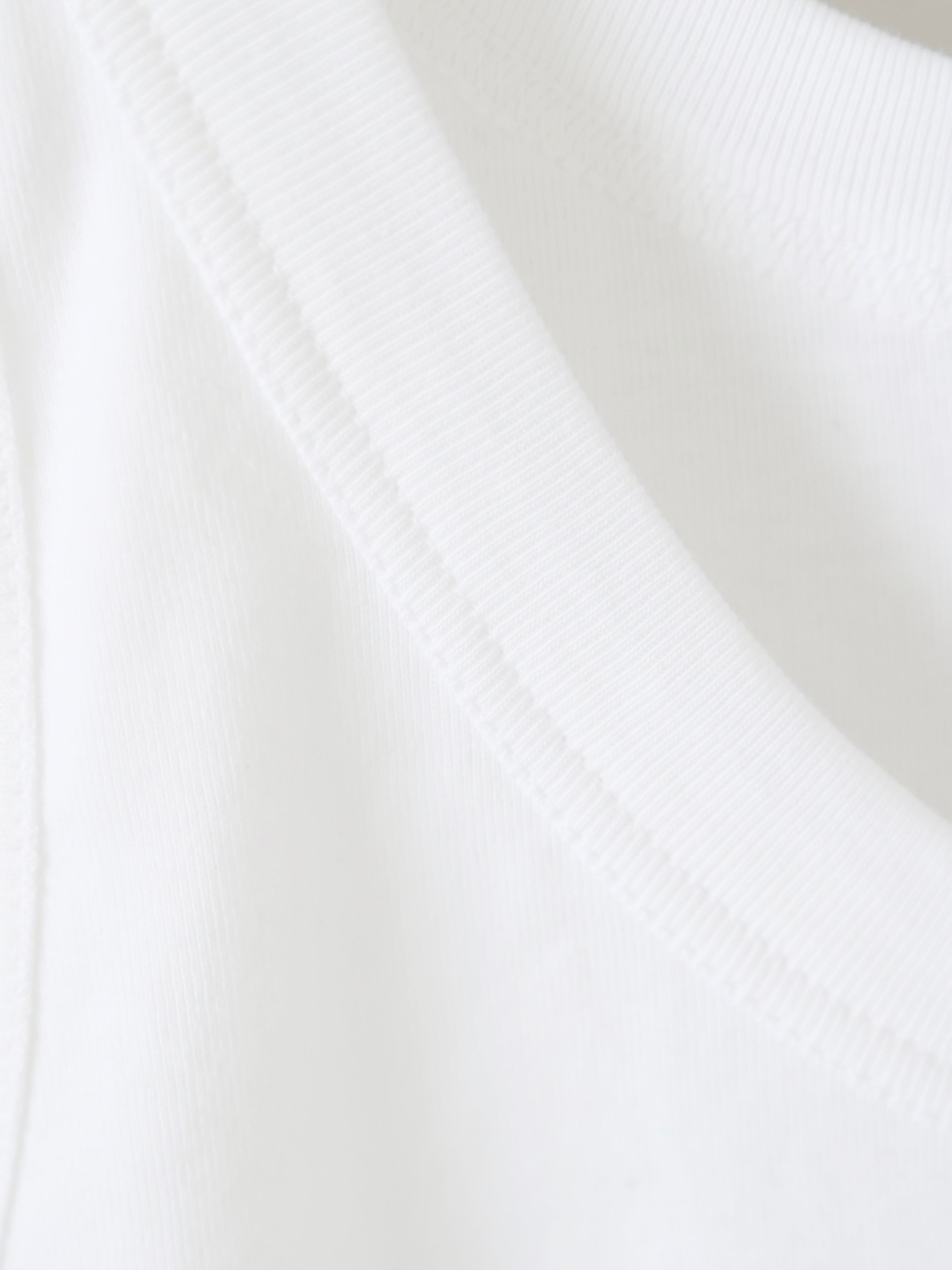 少し肉厚のフライス素材で透け感もなく、程よいフィット感とインナーが見えないアームホールのシンプルなシルエットに仕上がっています。