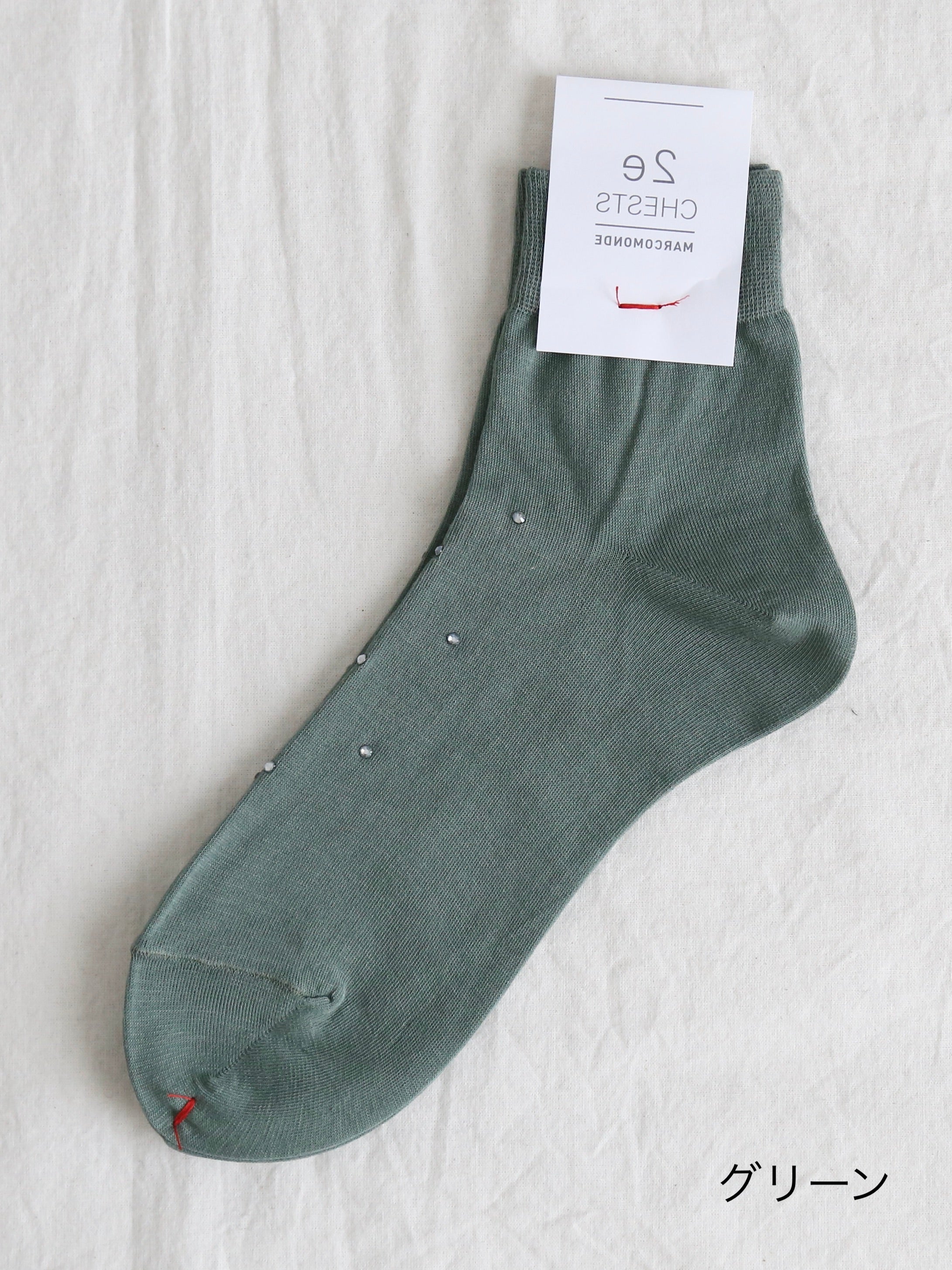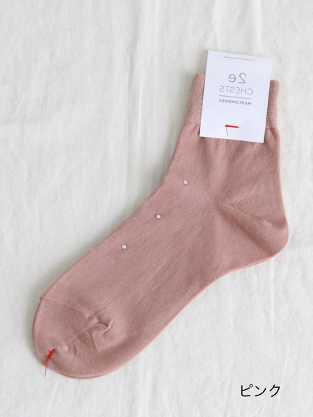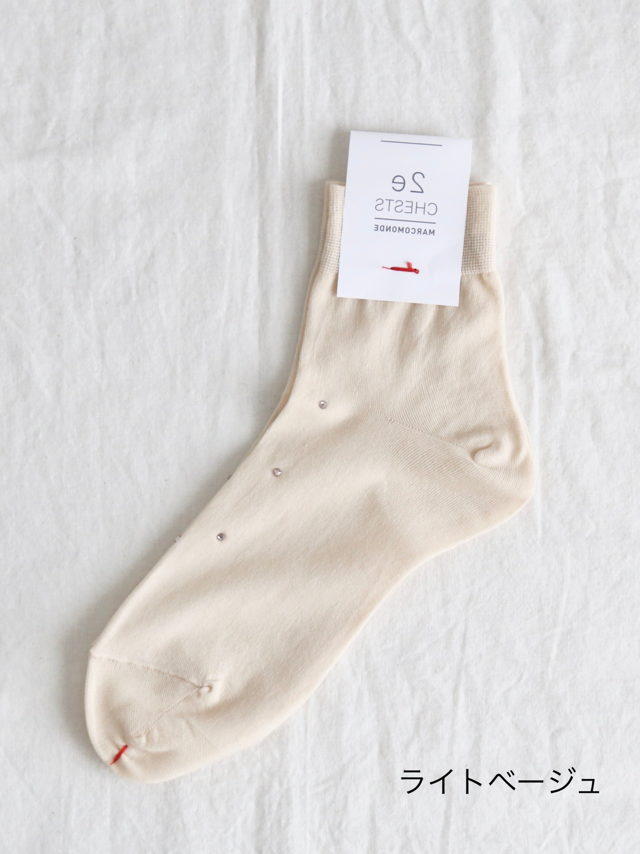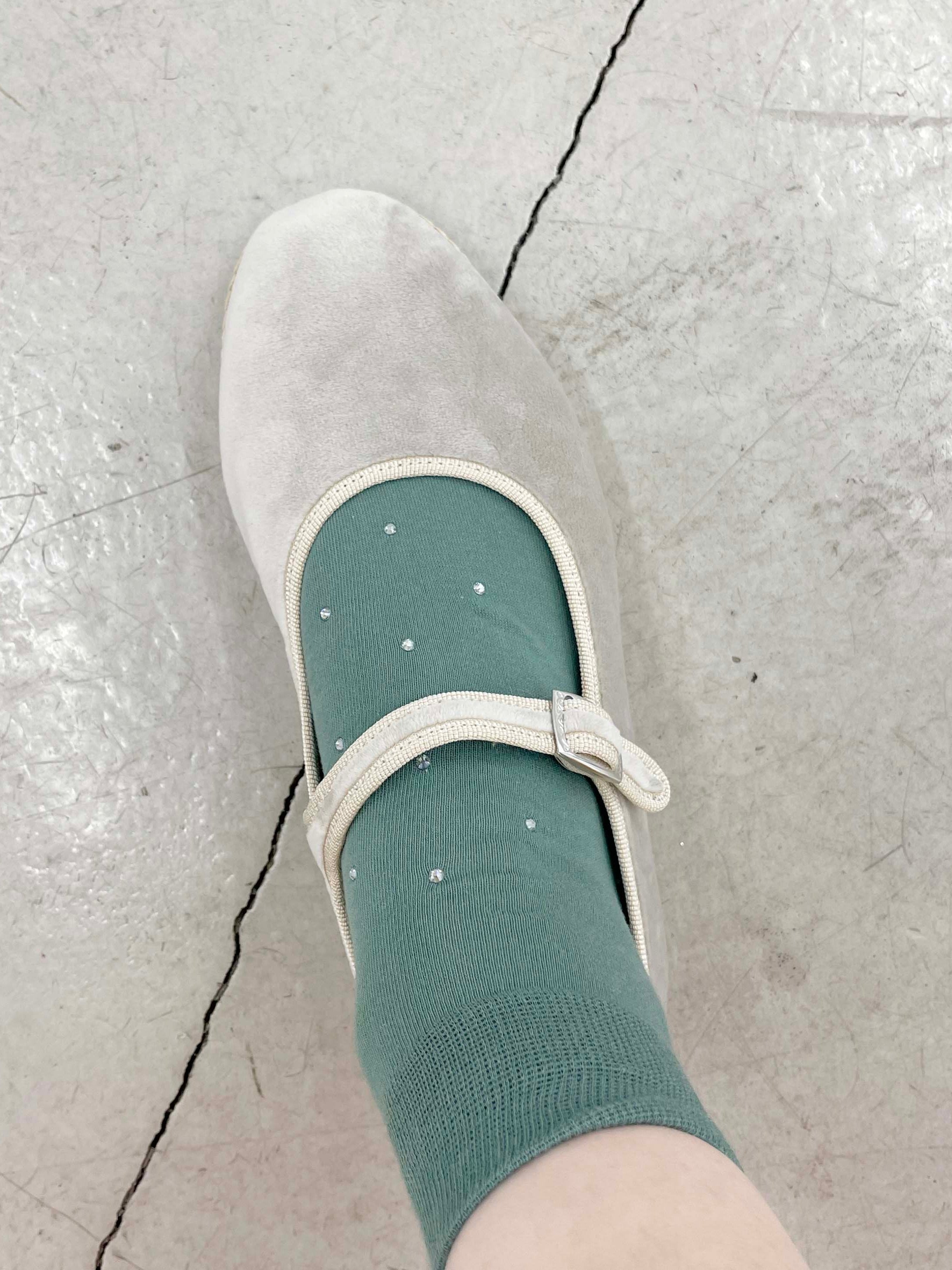 足の甲部分にストーンがついているのでスリッポンやメリージェンのようなストラップシューズと組み合わせてお洒落な足元を演出。