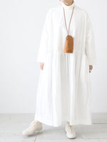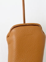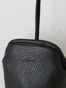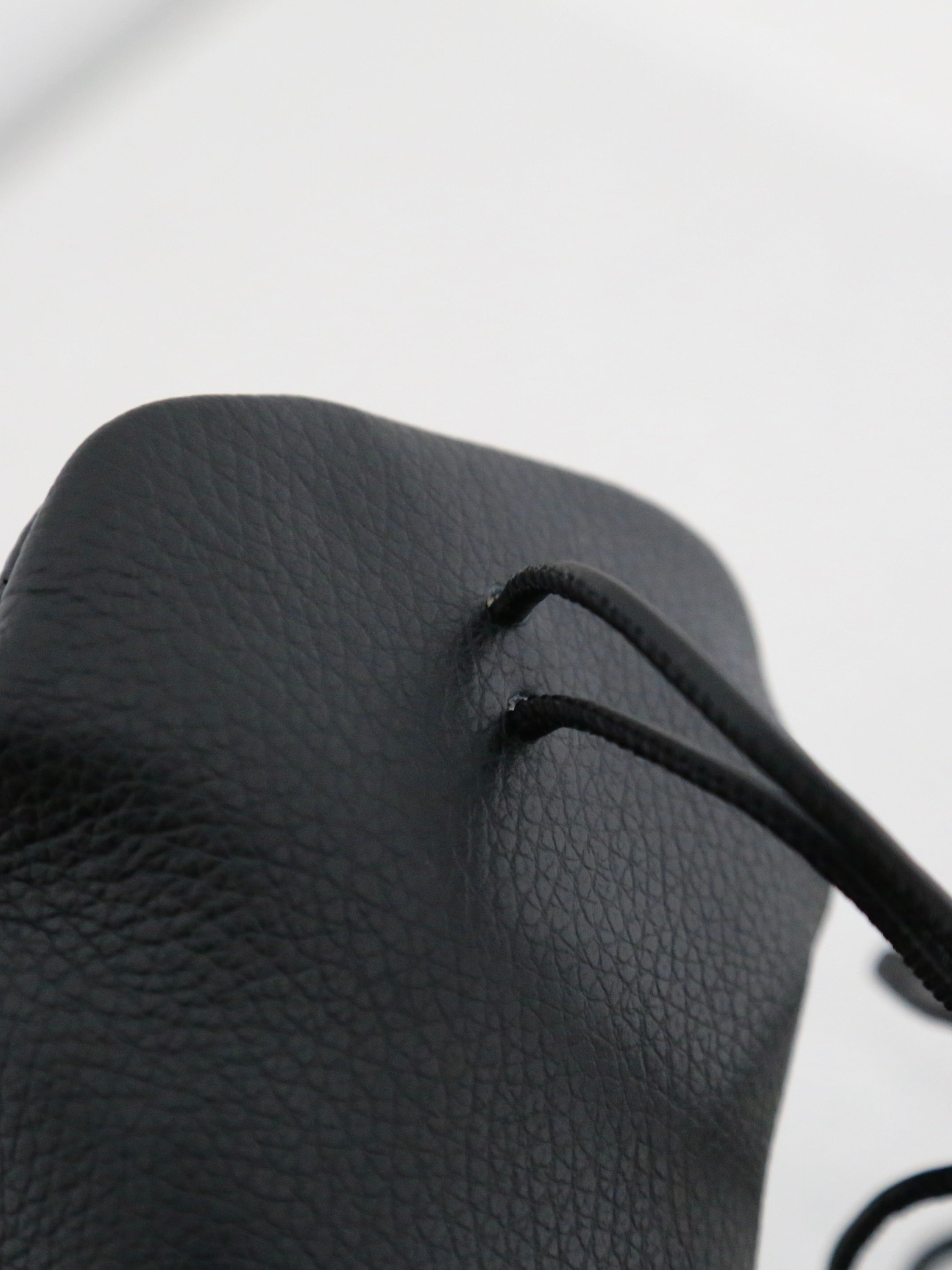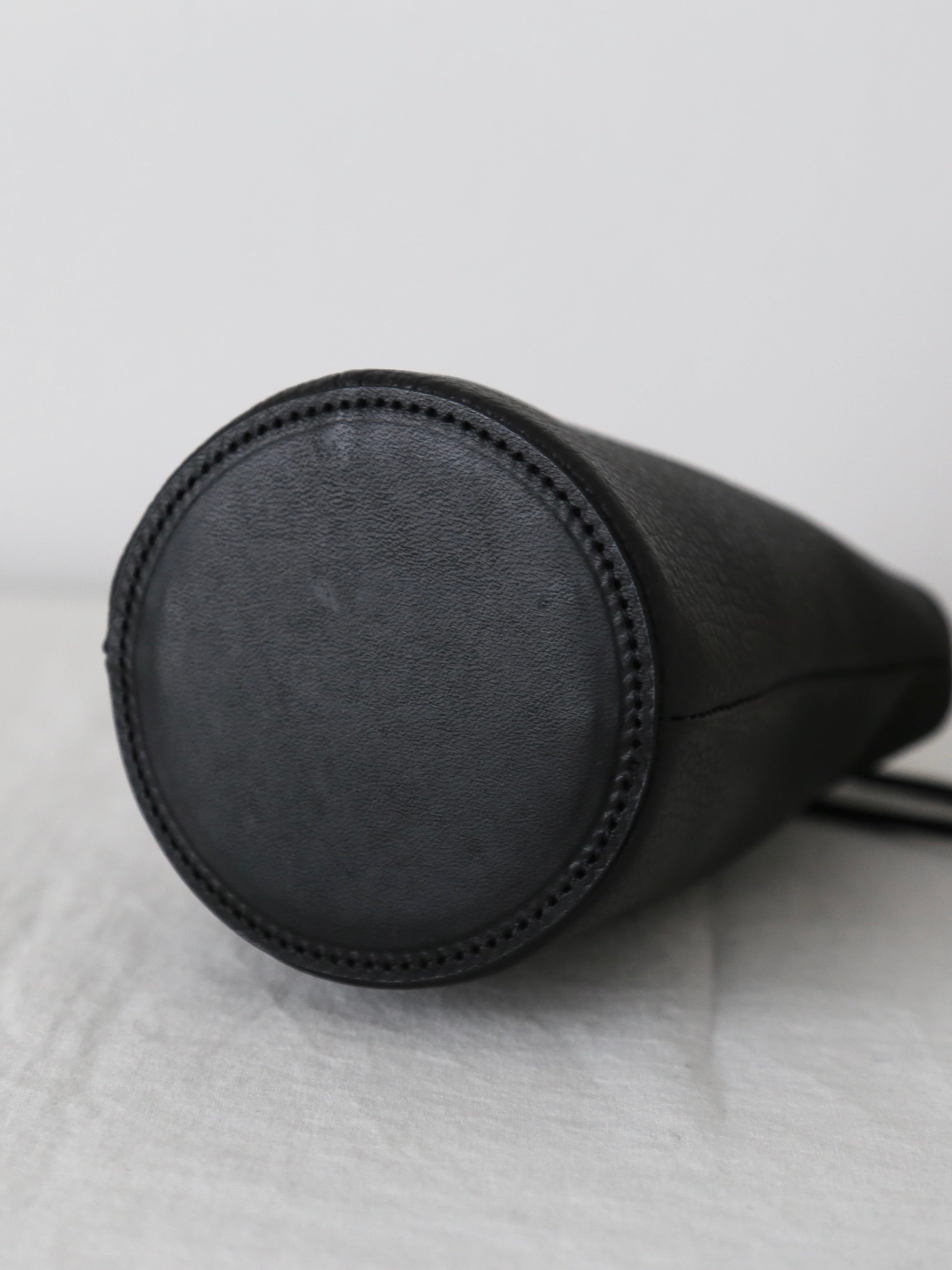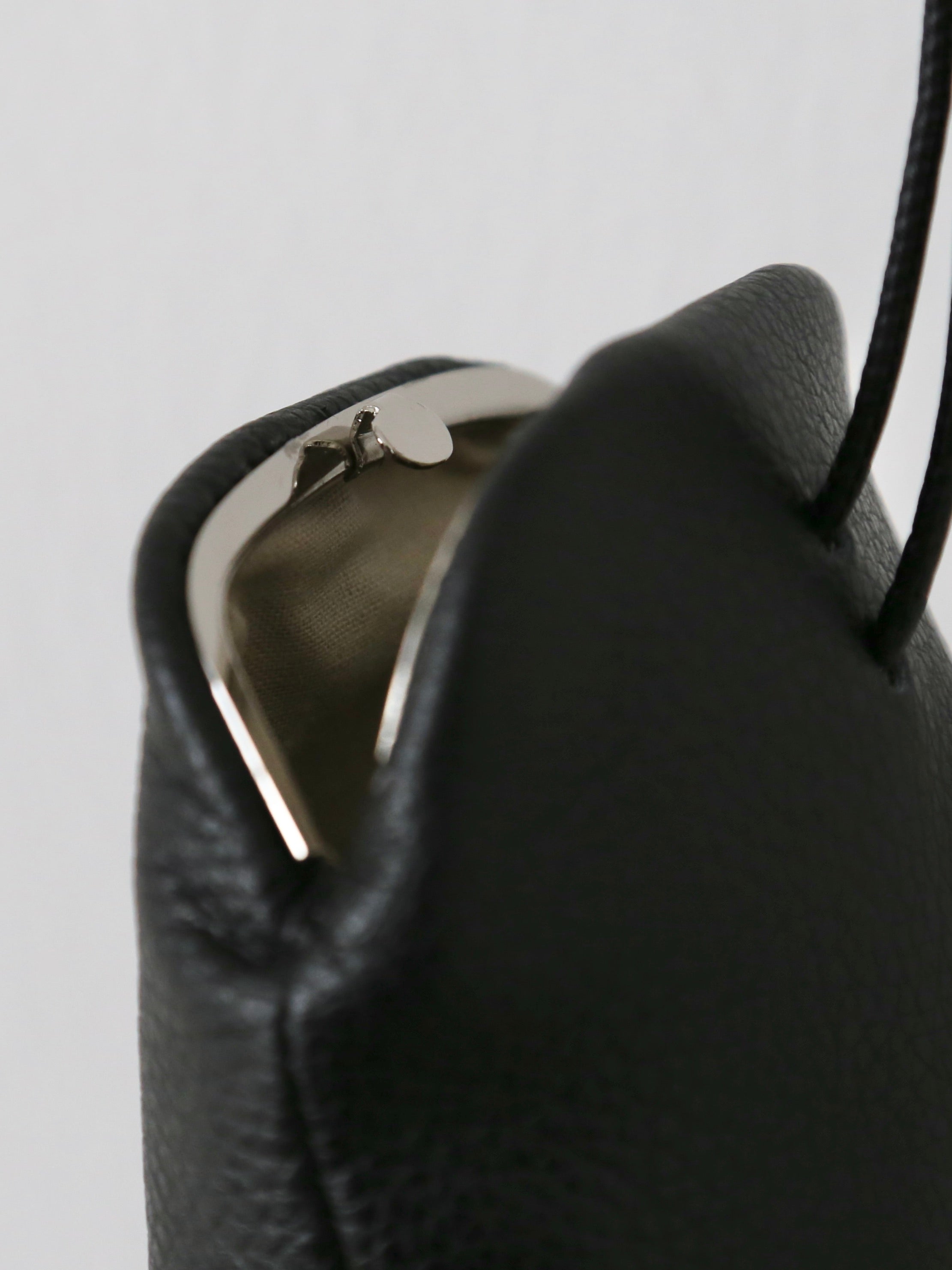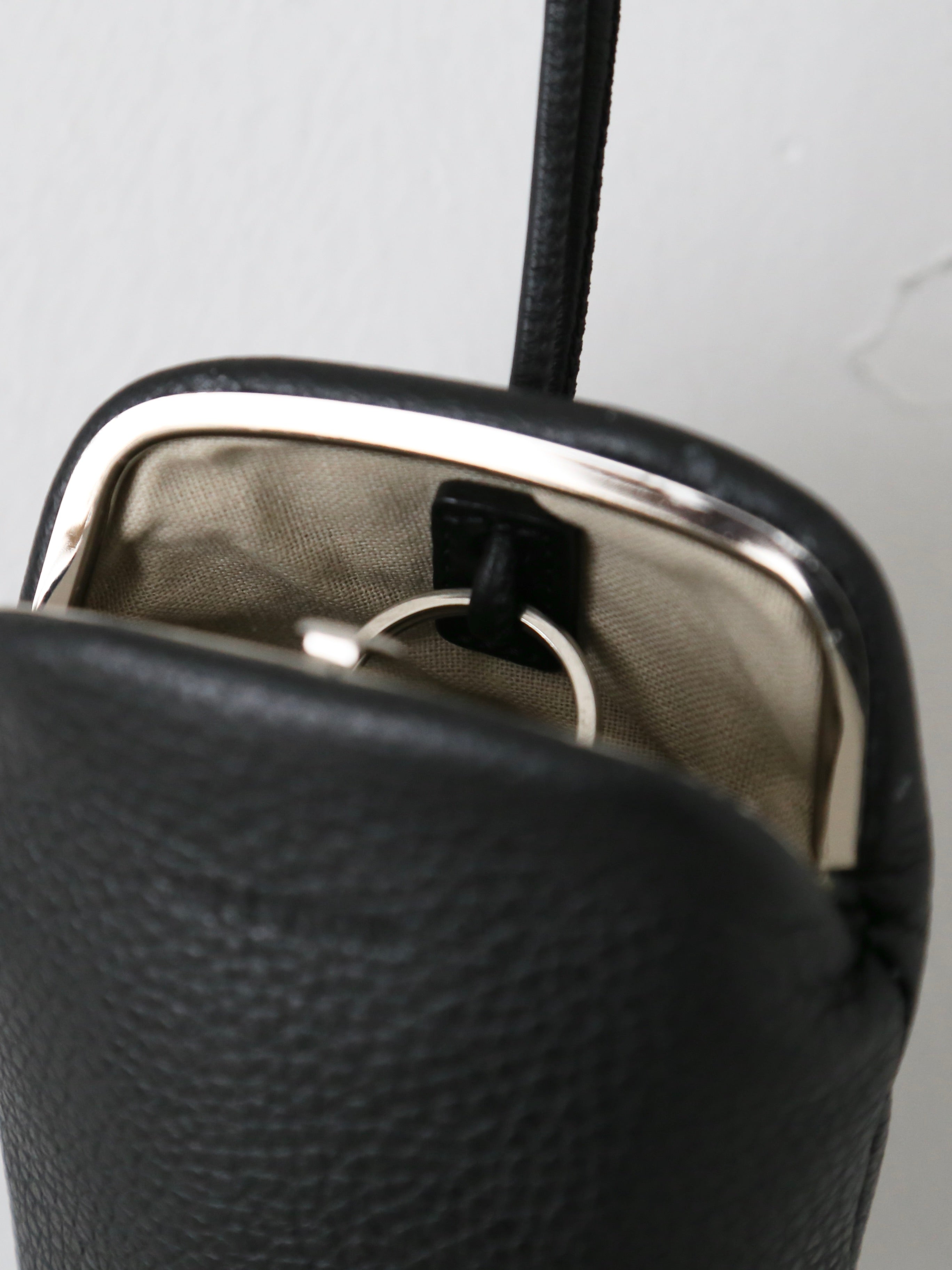 外側に開け閉めする金具が付いておらず、押して開閉するミニマルな口金を使用したユニークなギミックが魅力的な本作。底マチの正円から口元のフラットな形状までつながるシルエットが独特で、ユニークで存在感のあるフォルムになっているショルダーバッグです。