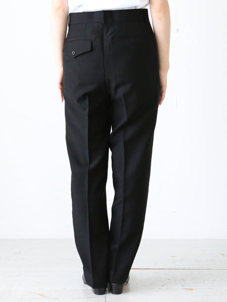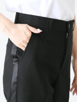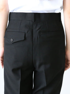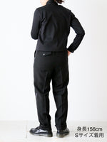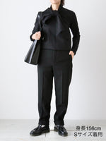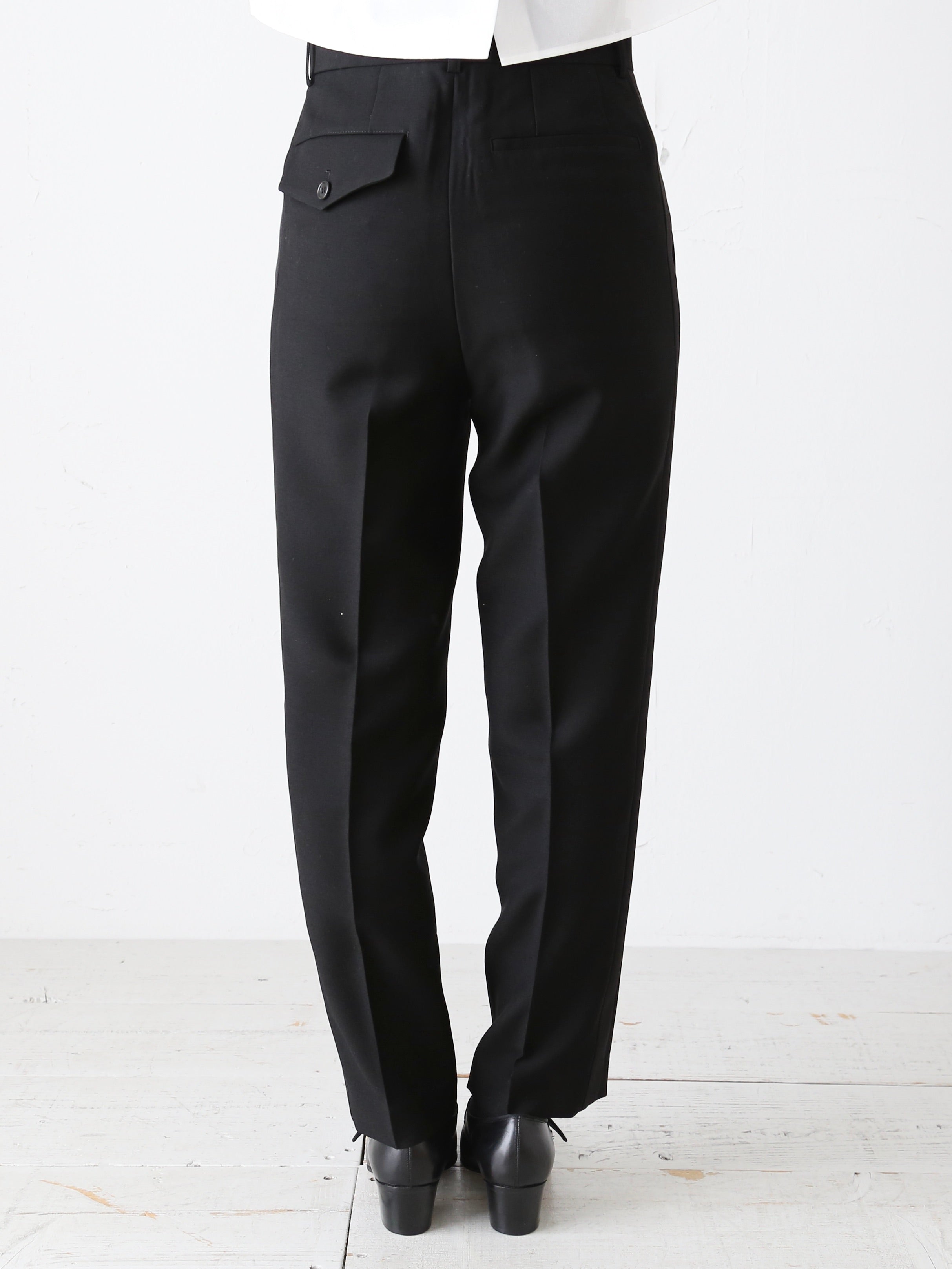 縦と斜めにストレッチが効いており、見た目よりずっと着心地が楽なのが嬉しいポイント。ハイウエストなのでトップスをインしても様に。シルエットもとても綺麗なテーパードシルエットなのでビジネスやパーティーなど幅広く様々なシーンでお使いいただけること間違いなしです。