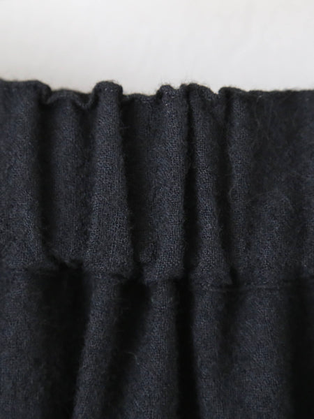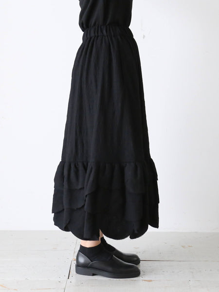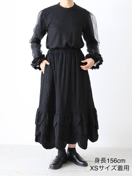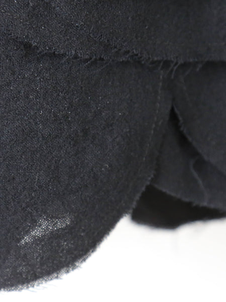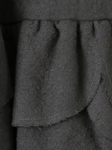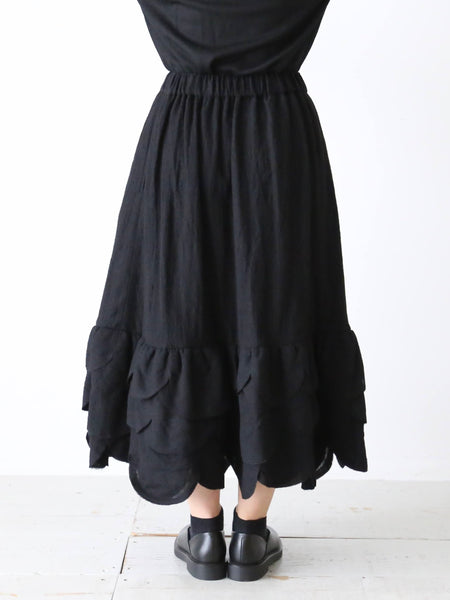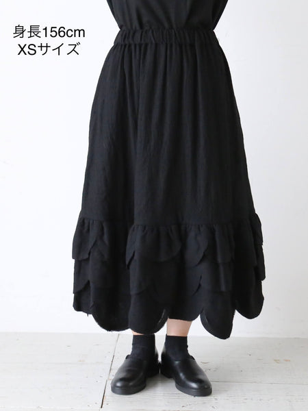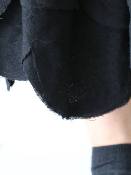 裾のデザインがポイントのウールスカートです。なんといっても特徴的なのが、まるで何枚も重ねられた花びらや葉っぱのようなデザインの裾。切りっぱなしで抜け感があり、軽やかな印象に。ふんわり軽やかなウール素材で、着心地も良いです。印象的なデザインながら派手すぎないので日常にも馴染みやすいアイテムです。noir kei ninomiya (ノワールケイニノミヤ)Comme des Garçonsウールナイロンミルドスカート [3P-S007-051]色:黒素材:毛100% サイズ:XS/SXSサイズ:ウエスト33cm〜47cm 着丈:78cmSサイズ:ウエスト34cm〜49cm 着丈:81cm※着丈について、ヒラヒラの一番長いところで計測*平置き寸法です。多少の誤差はご容赦くださいませ。
