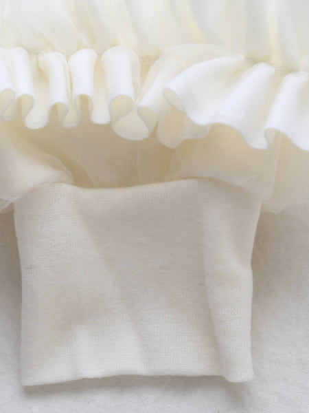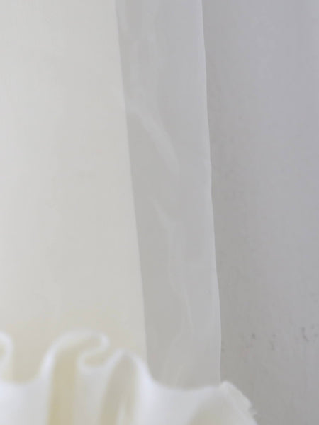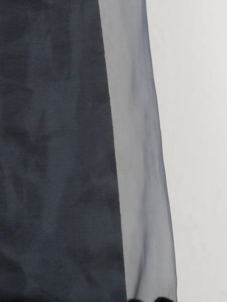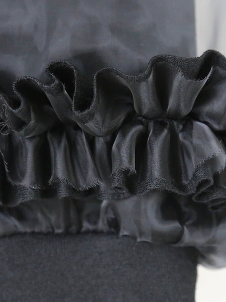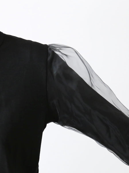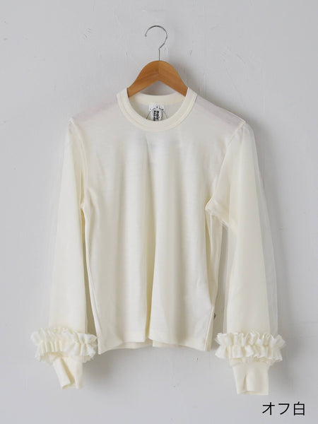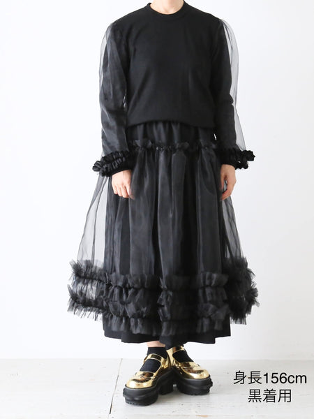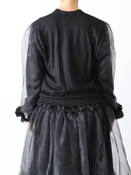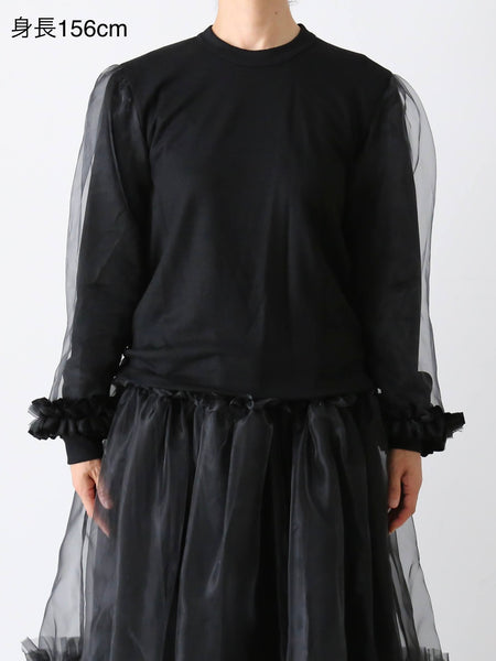 noirらしいオーガンジーのトップスです。ベースはシンプルなウールのトップス。程よい厚みで軽やか、着心地も良いです。お袖部分にのみオーガンジー生地がドッキング。ふんわり立体的なオーガンジー部分からウール袖が透け、華やかに。袖口にはフリル、そしてリブ。甘さがありながらも日常にも馴染むデザインです。noir kei ninomiya (ノワールケイニノミヤ)Comme des Garçonsウール天竺×エステルオーガンジートップス [3P-T006-051]色:黒/オフ白素材:毛100% (別布)ポリエステル100%サイズ:S肩幅:40cm 身幅:45cm アームホール:21cm 袖丈:59cm 着丈:52cm*平置き寸法です。多少の誤差はご容赦くださいませ。