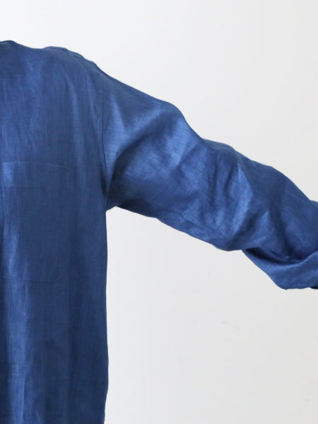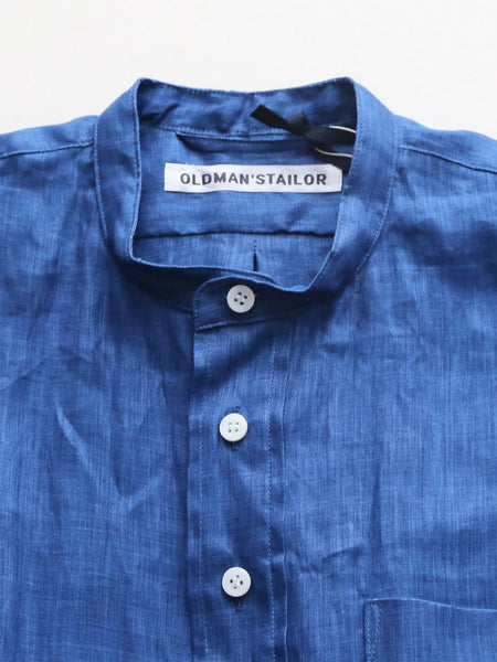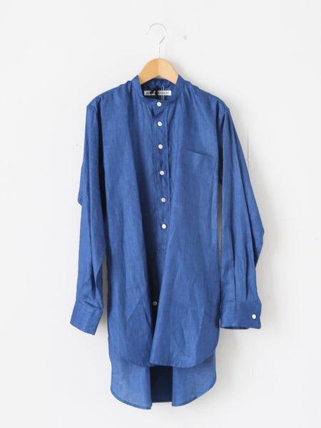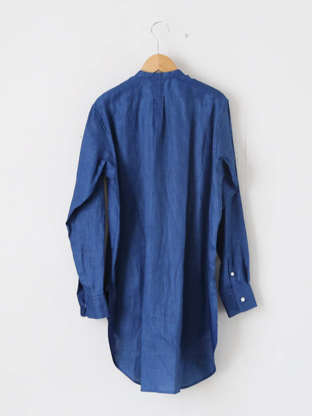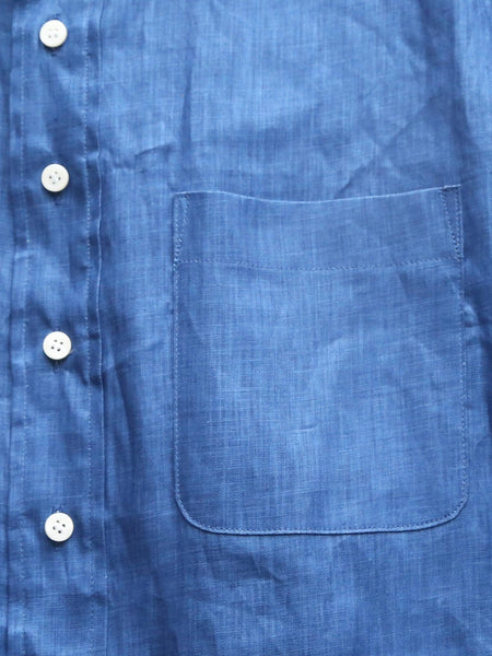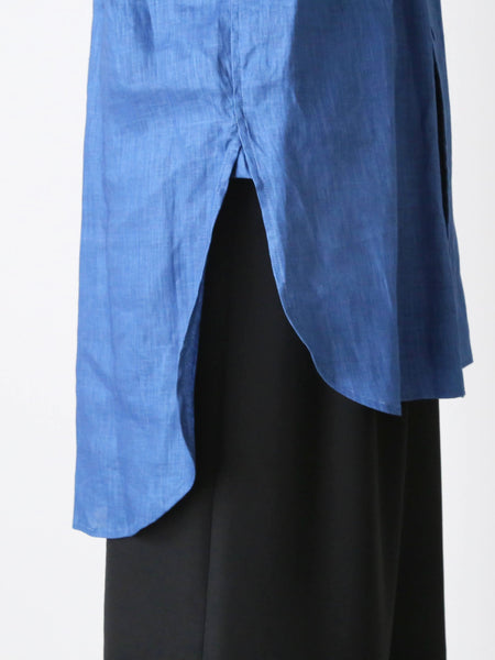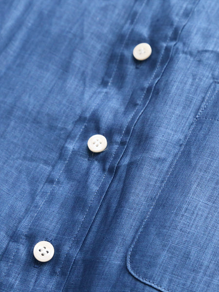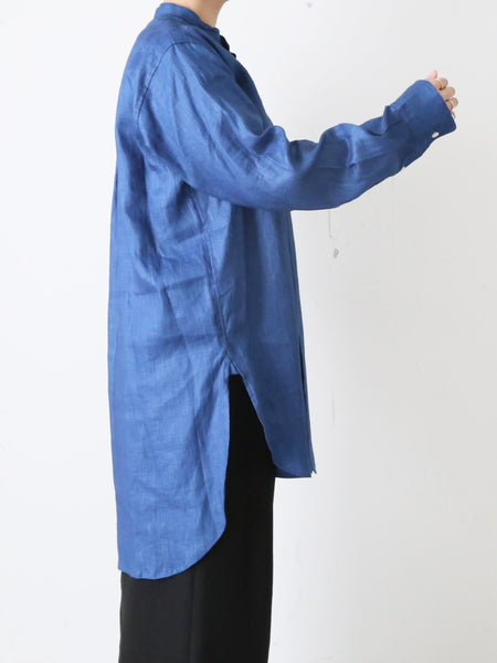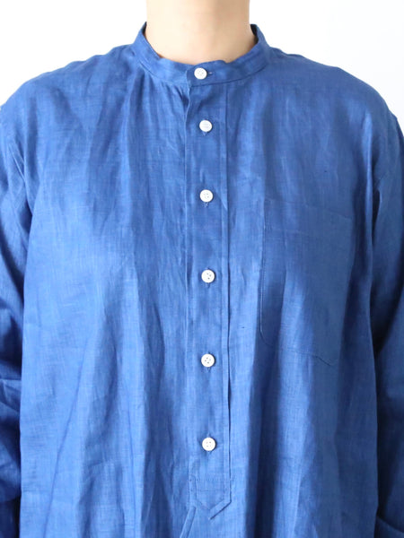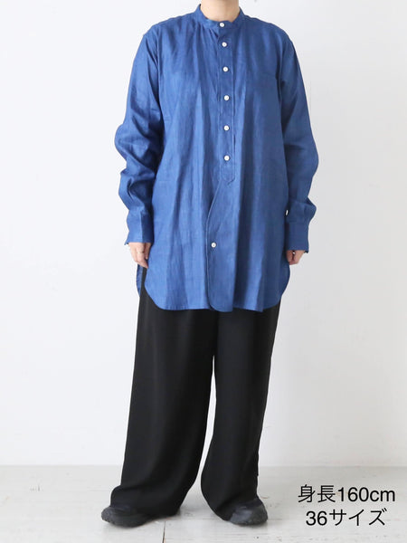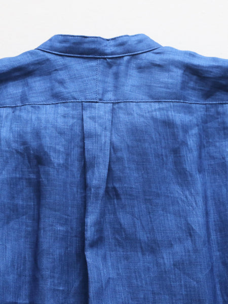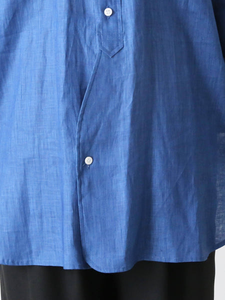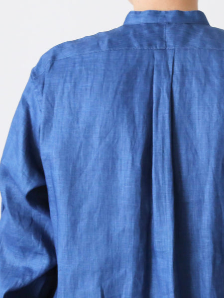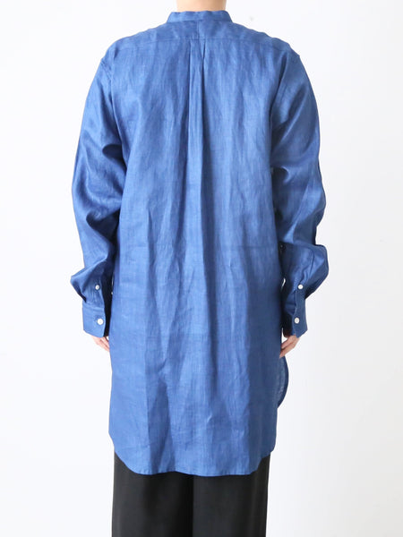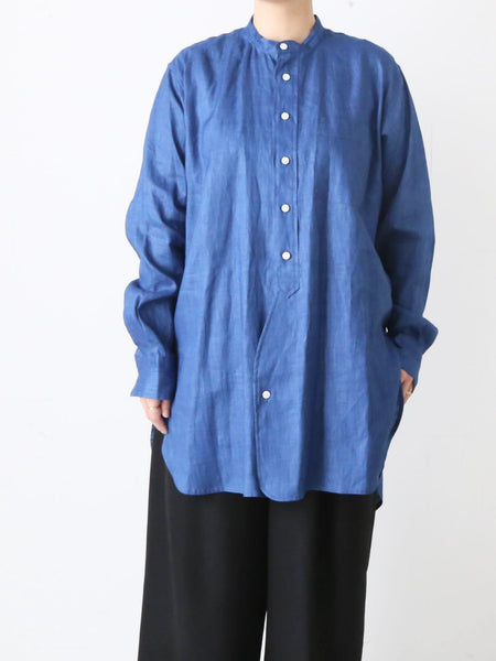 綺麗なブルーが爽やかな、バンドカラーのリネンシャツです。