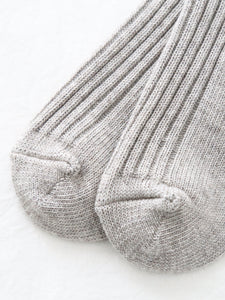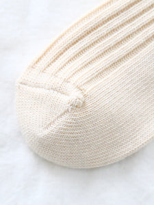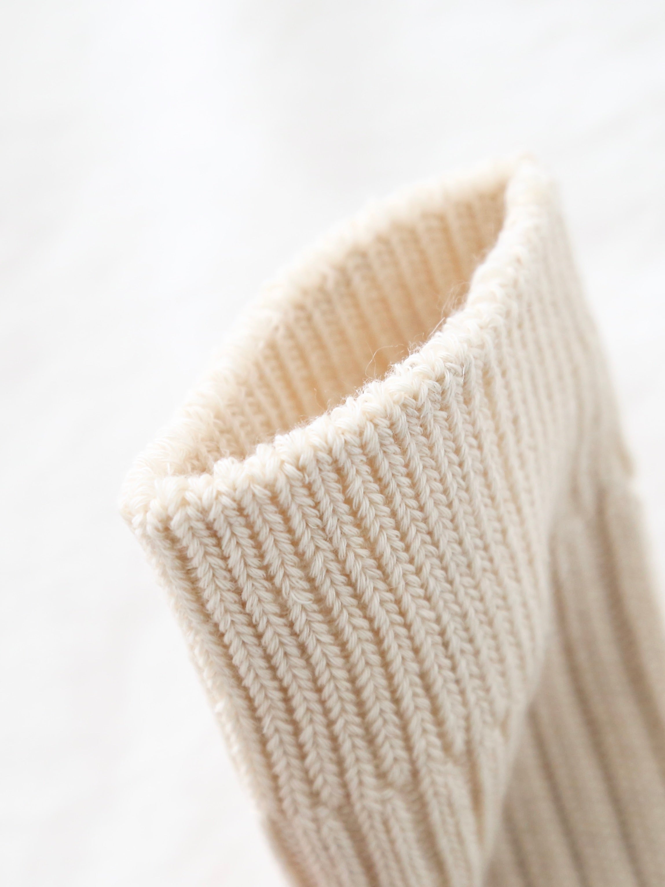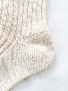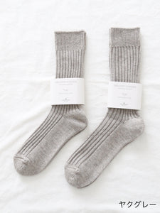 オーガニックコットンと希少なホワイトヤクの混紡糸を使用したベーシックなローケージリブソックスです。