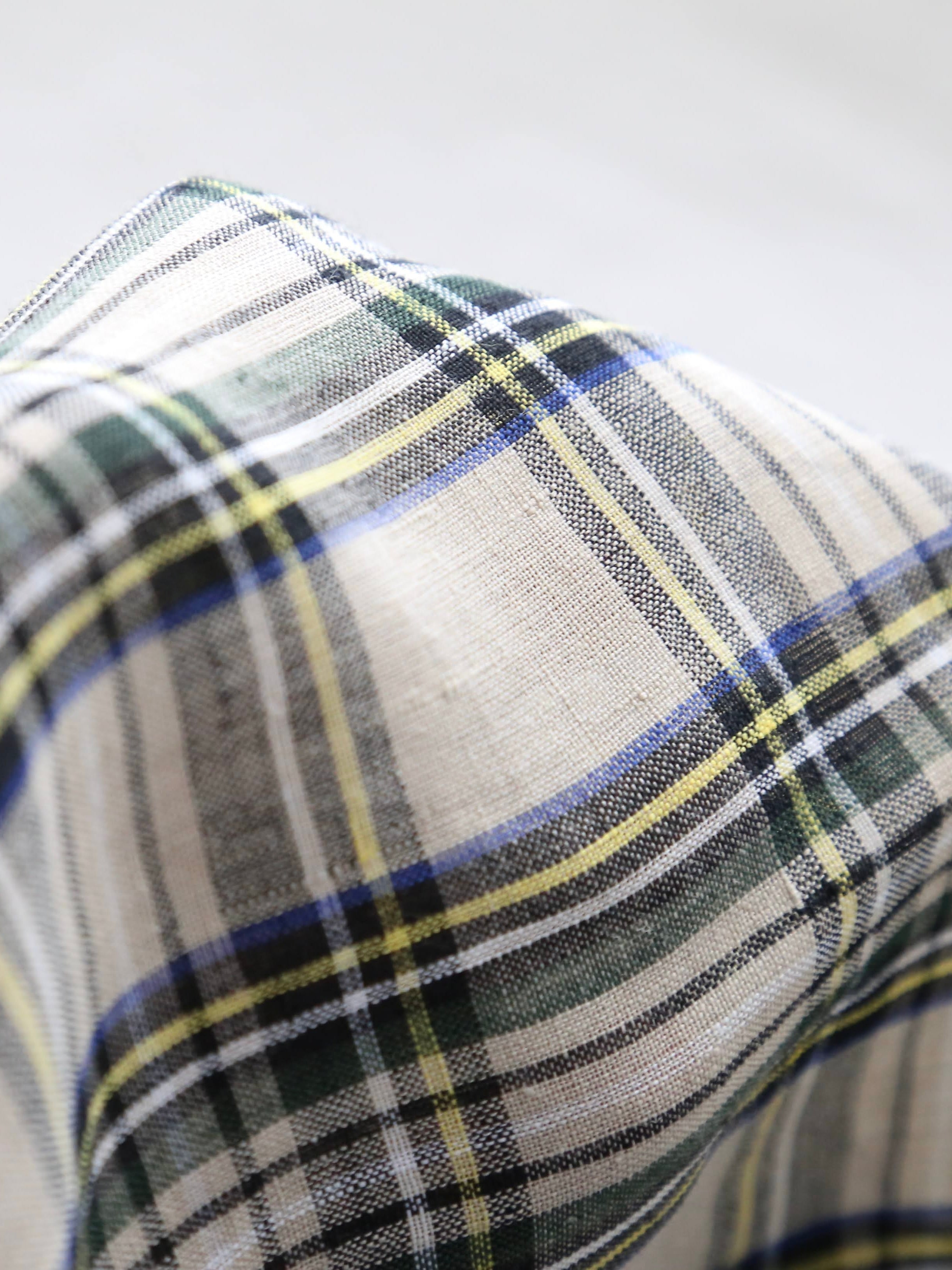 フラックスの地の色にブルー、ブラック、グリーン、イエローの渋めのタータンチェック。