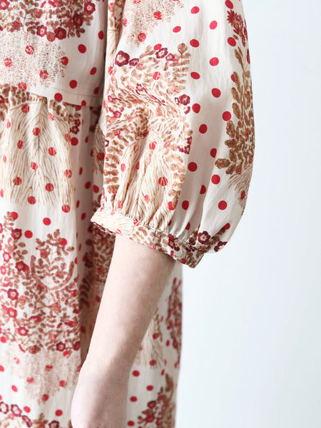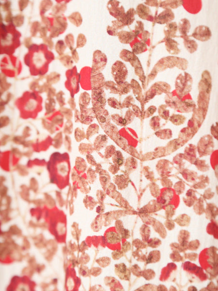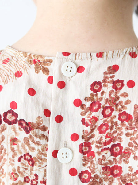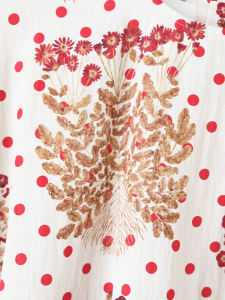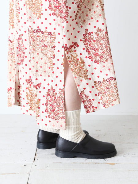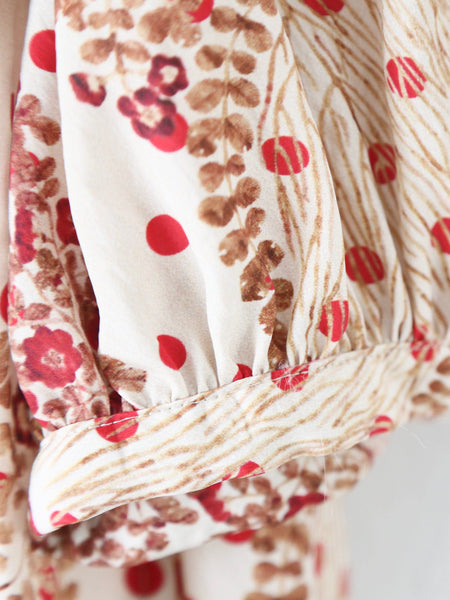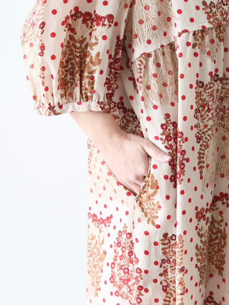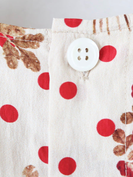 A柄はベージュ地に赤い水玉と、小花を咲かせた植物が根っこと共に描かれた素敵なアイテム。