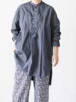 低めのスタンドカラーのプルオーバーシャツですが、丈は長め。