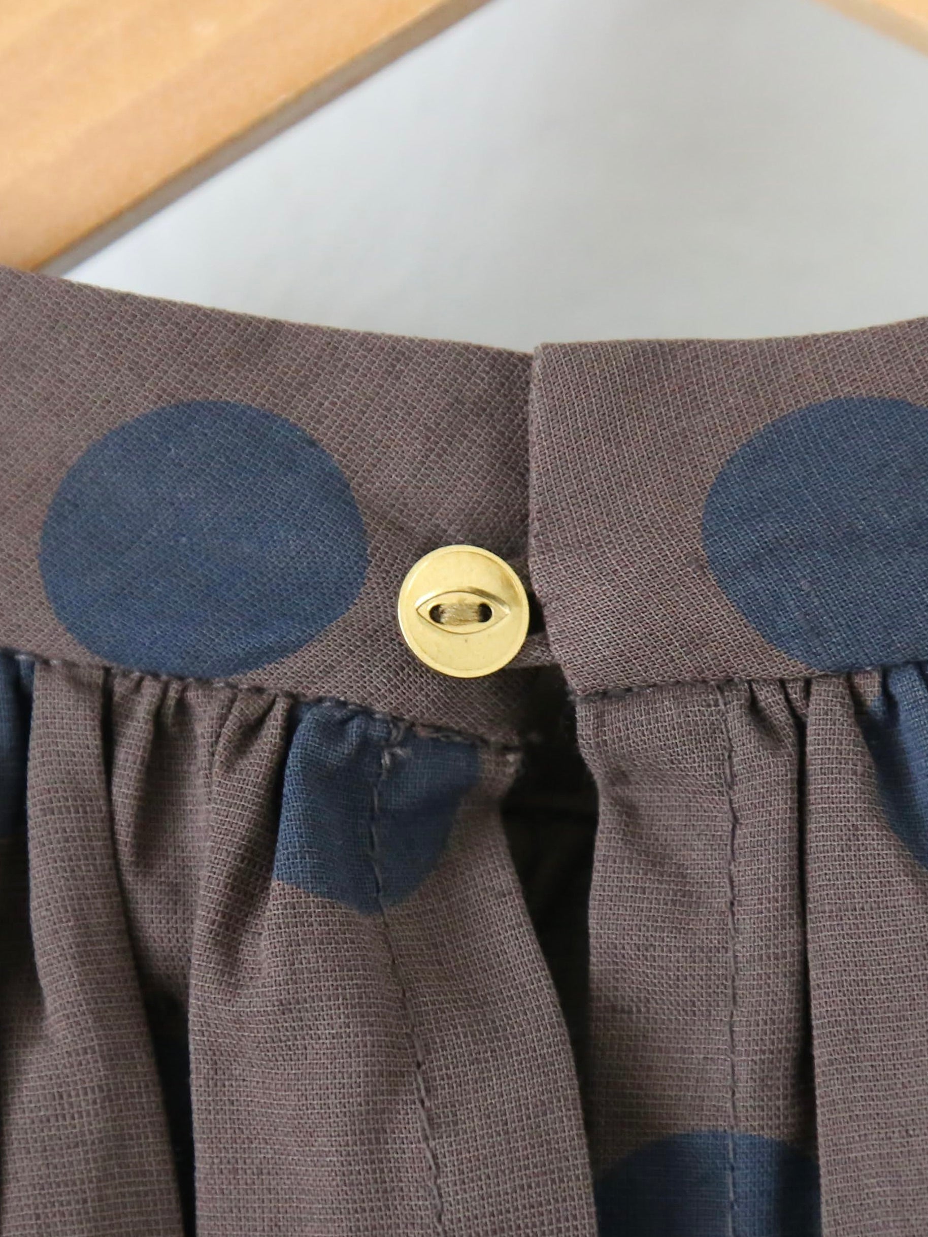 衿ぐりや袖口にたっぷりとギャザーを入れ、ふんわりと広がるAラインシルエットに仕上がっています。